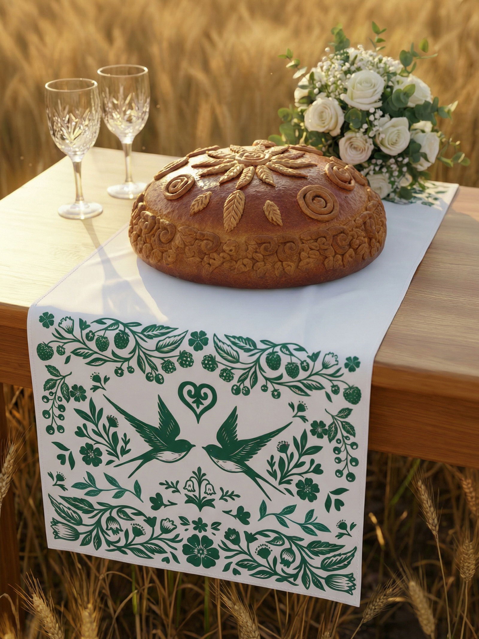 Рекомендации по уходу: Бережный режим глажки, Деликатная стирка при 30 ℃, Не отбеливать Цвет: Белый, Зелёный Тематика праздника: Венчание, Свадьба Тематика: Птицы, Узоры Размер упаковки: 14 x 1 x 21 см. tnved: 6302539000 Честный знак: Честный знак Адресат: Молодожёнам Длина, см: 150 Ширина, см: 36 Размер, см: 150 x 36 Свадебный рушник с ласточками и зелёным орнаментом символ начала новой жизни, наполненной ростом, гармонией и верностью. Белый фон отражает чистоту чувств, а зелёные узоры и птицы признак весны, обновления и домашнего уюта. Такой рушник подчеркнёт значимость свадебного или венчального обряда и станет бережно хранимым напоминанием о самом важном дне в жизни молодожёнов. Особенности