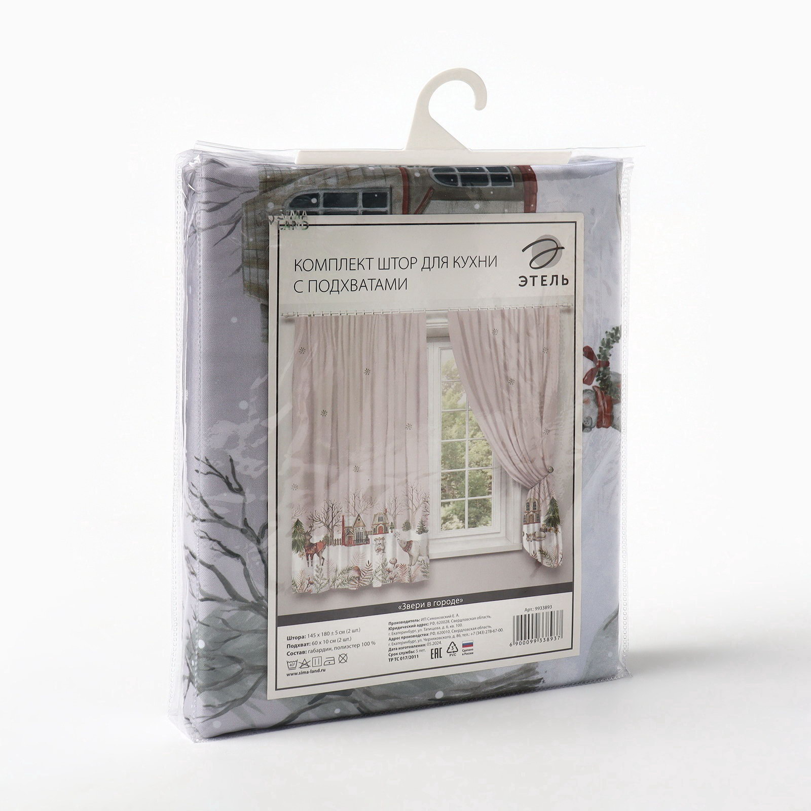 Комплект штор для кухни с подхватами "Этель. Звери в городе", 2 шт., белые, 145x180 см, Этель, Россия