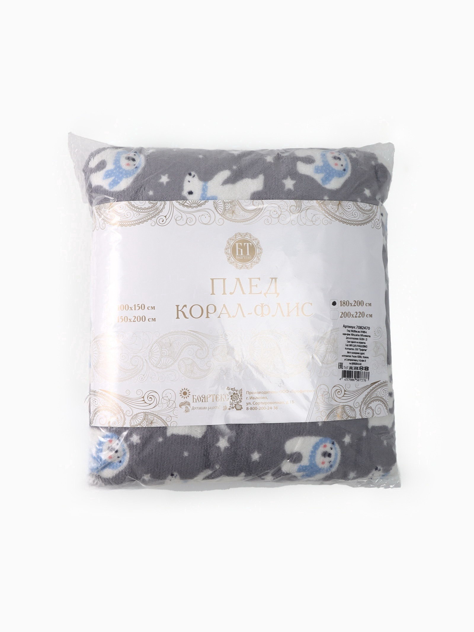 Плед новогодний, 180x200 см, корал-флис, серый, БОЯРТЕКС, Россия