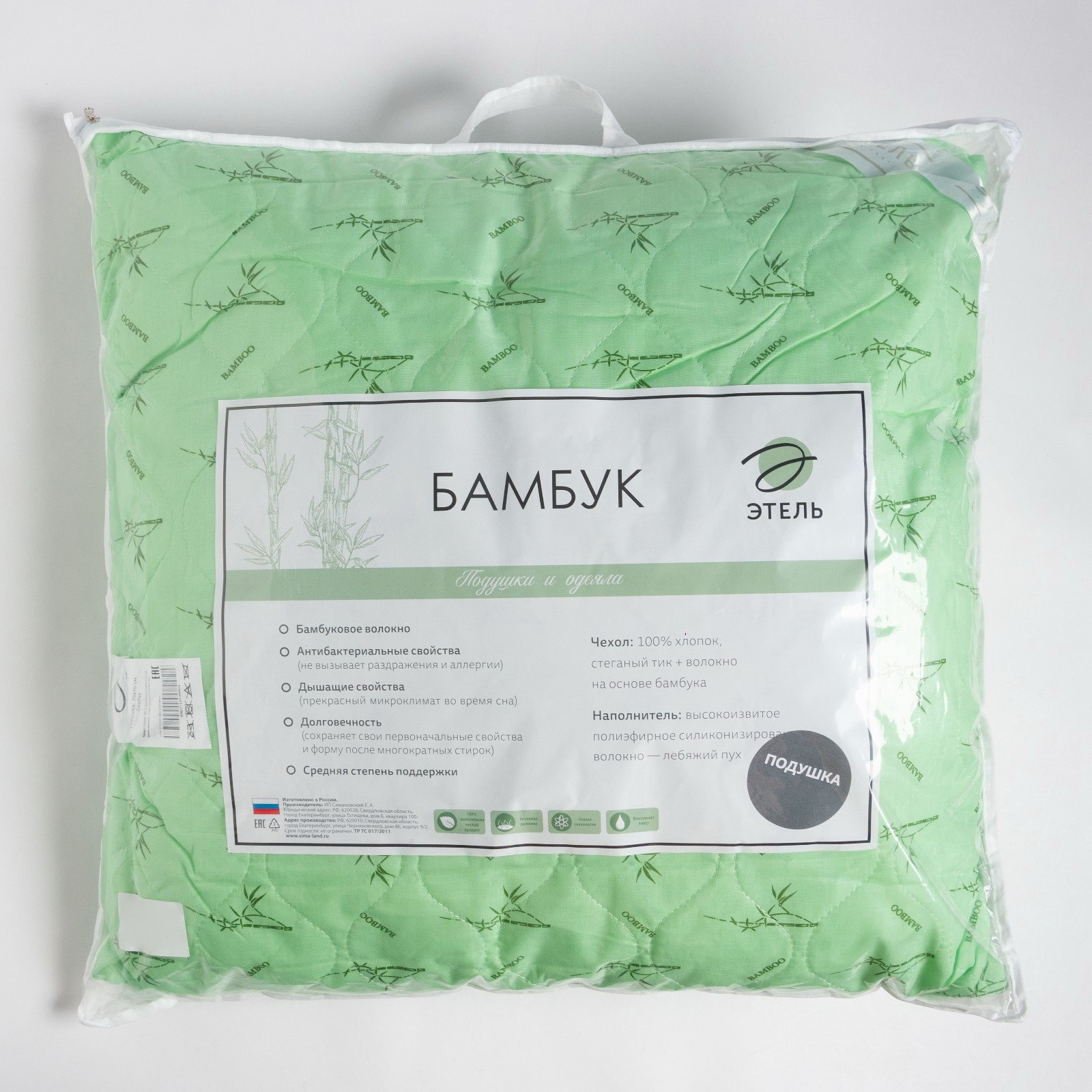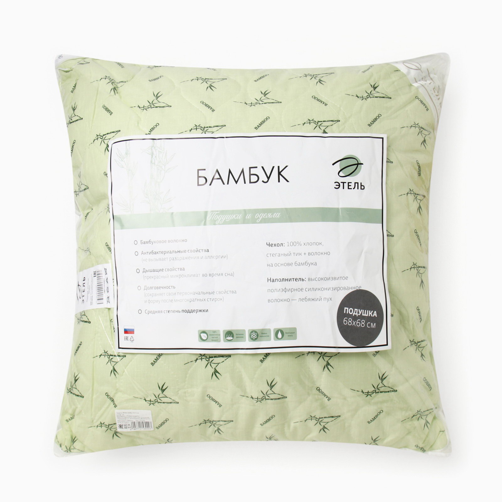 Материал наполнителя: Бамбуковое волокно, Искусственный лебяжий пух Рекомендации по уходу: Барабанная сушка запрещена, Глажка запрещена, Не отбеливать, Стирка при 30 ℃ Сезон: Весна, Зима, Лето, Осень Размер упаковки: 63 x 10 x 65 см. Высота подушки: Средняя Ткань: Тик Цвет: Зелёный На молнии: Нет Состав ткани: Хлопок Размер, см: 70 x 70 Тип упаковки: Старая tnved: 9404400000 tnved: 9404400000 Вид упаковки: PVC-пакет Фактура материала: Гладкий Декоративные элементы: Без элементов Размер под наволочку, см: 70 x 70 Тематика: Цветочно-растительная Такая уютная, удобная и практичная! Мягкая, комфортная и такая красивая подушка "Этель" Бамбук подарит вам только добрые сновидения и по-настоящему прекрасное утро. К чехлу простёган наполнитель из бамбукового волокна, а в качестве основы используется нежнейший лебяжий пух. Натуральное, экологически чистое современное целлюлозное волокно обладает массой полезных свойств. А потому эта подушка не только обеспечивает правильное положение тела ночью, но и отличается: