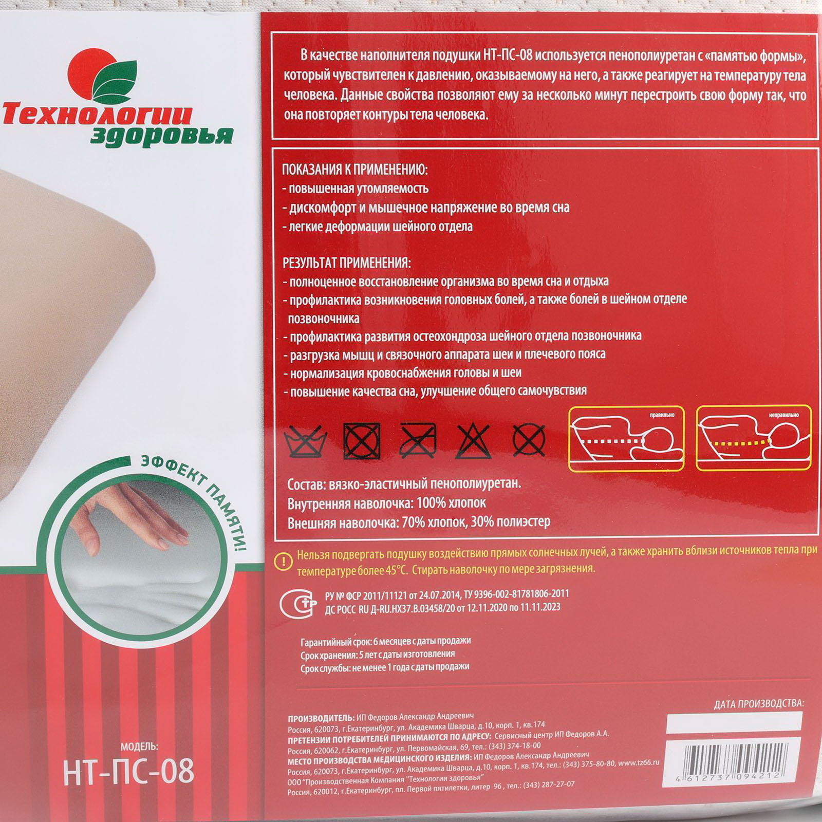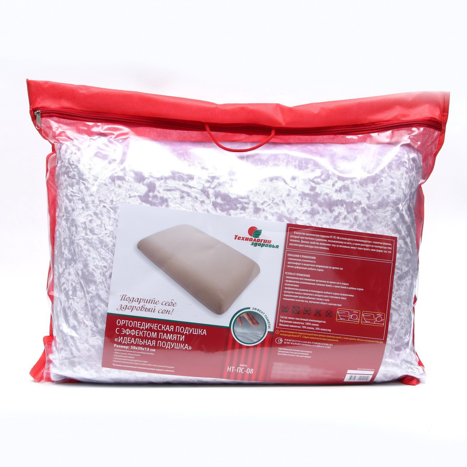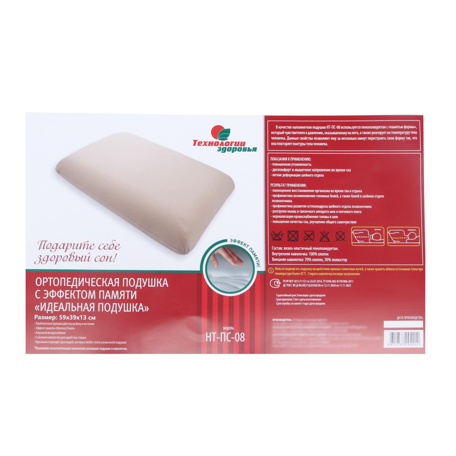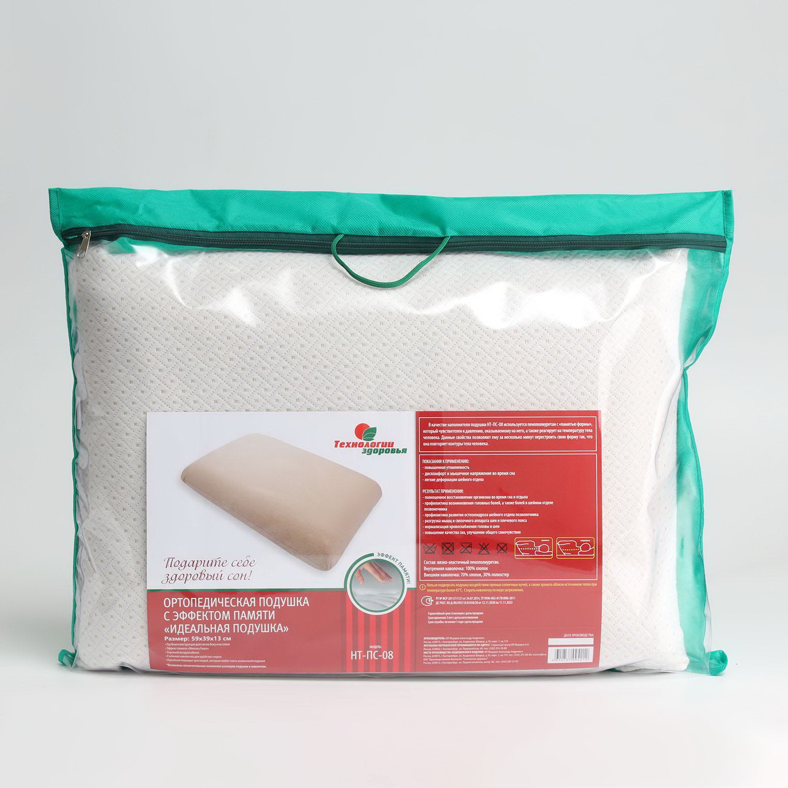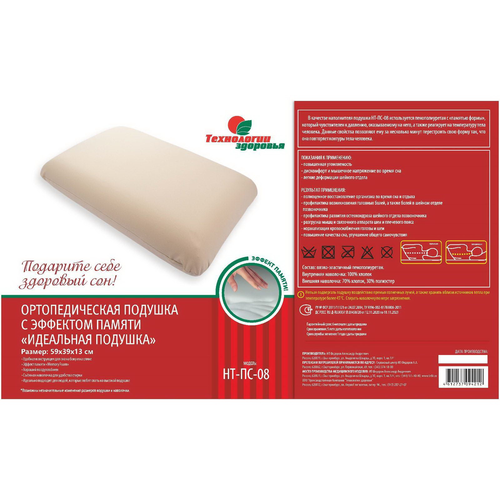 Подушка ортопедическая НТ-ПС-08 "Идеальная подушка", с эффектом памяти, 59x39 см, валики 13 см, 53.5x66x13 см., Технологии здоровья, Россия