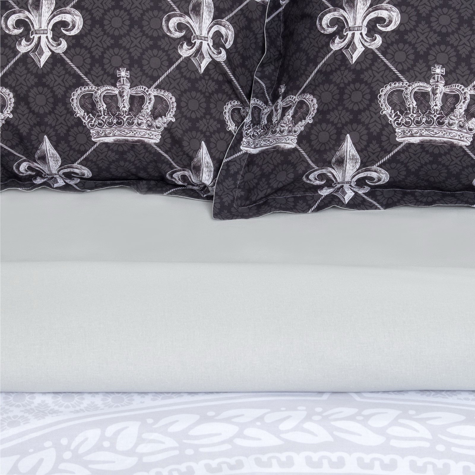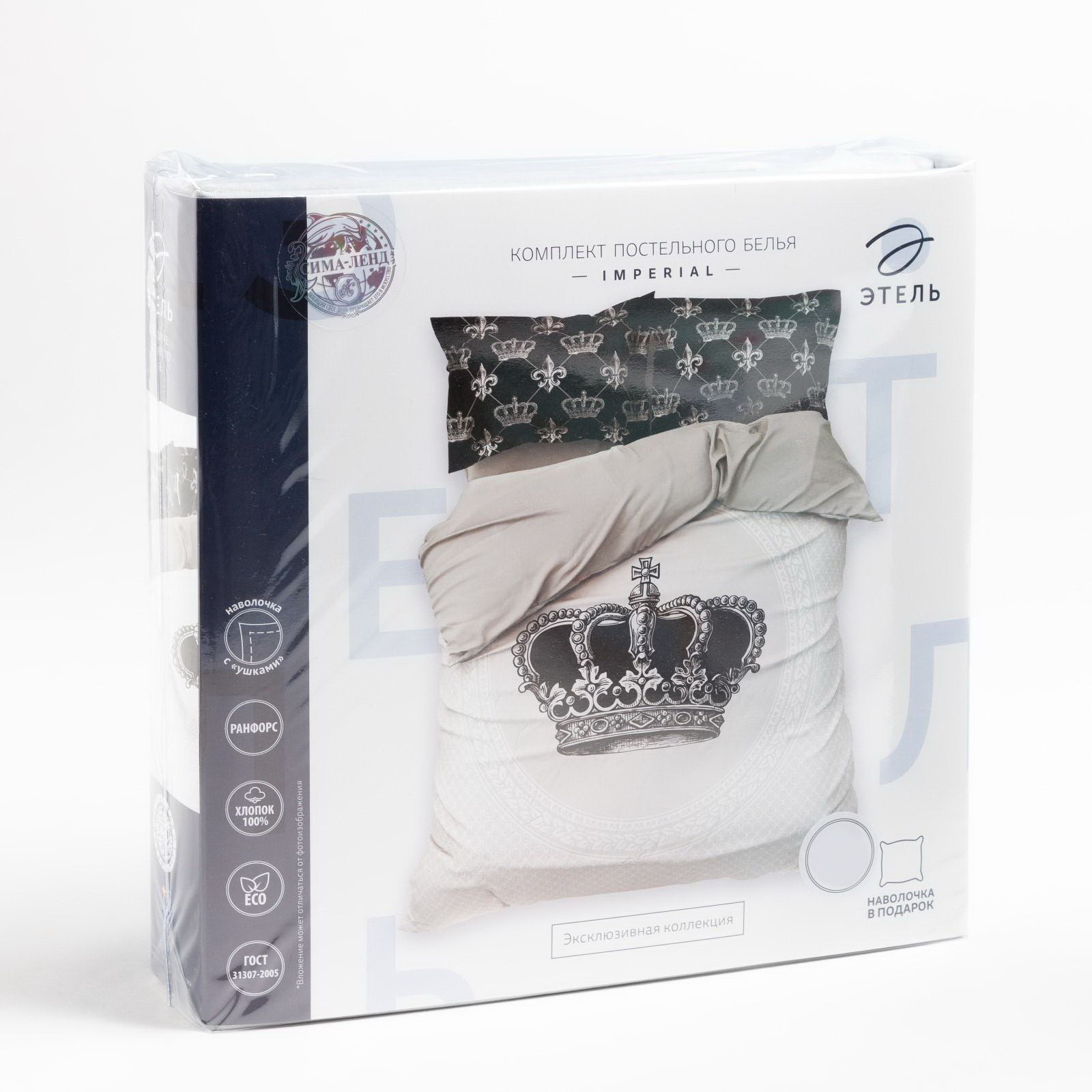Цвет: Белый, Серый, Чёрный Комплектация: 2 наволочки, Пододеяльник, Простыня Рекомендации по уходу: Бережный режим глажки, Не отбеливать, Стирка при 40 ℃ Размер упаковки: 30 x 7 x 30 см. Плотность ткани: Высокая Размер простыни, см: 200 x 220 Режим стирки: При 40 градусах Размер пододеяльника, см: 175 x 215 Количество наволочек: 2 Вид простыни: Стандартная Размер: 2-спальное см Состав ткани: Хлопок Ткань: Ранфорс Плотность, г/?2: 111 Размер наволочки, см: 50 x 70 На резинке: Нет На молнии: Нет tnved: 6302210000 tnved: 6302210000 Вид застёжки пододеяльника: Без застёжки Фактура материала: Гладкий Особенности простыни: Стандартная Коллекция: Imperial Отделка: Без отделки Простыня в комплекте: Да Вид застёжки наволочки: Клапан Вид упаковки: PVC-пакет Декоративные элементы: Оксфордские ушки Тематика: Корона Маркировка: Честный знак Постельное бельё из коллекции "Ранфорс" ТМ "Этель" отличается авторским дизайном и доступной ценой, изготовлено из натуральной ткани. В чём преимущества ранфорса? Это новая ткань из натуральных хлопковых волокон, которая по характеристикам и тактильным ощущениям значительно превосходит бязь, поплин и почти не уступает сатину. К особенностям ранфорса относятся: