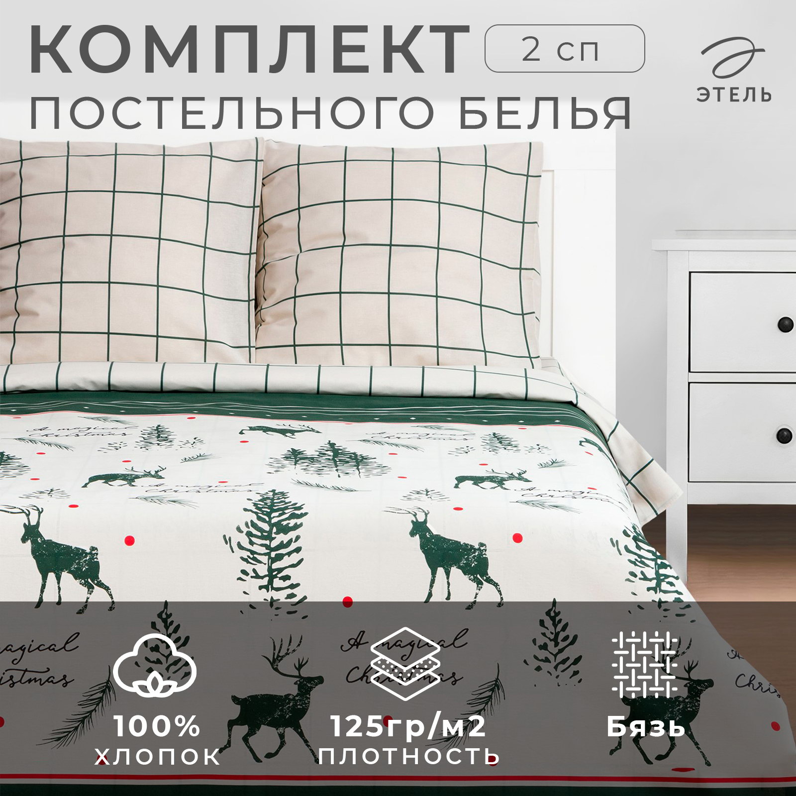 Комплектация: 2 наволочки, Пододеяльник, Простыня Сезон: Демисезон, Зима, Зима, Осень Тематика: Новогодняя, Рождественская Рекомендации по уходу: Барабанная сушка при низкой температуре, Глажка при 150 ℃, Не отбеливать, Стирка при 40 ℃ Тематика праздника: Новый год, Рождество Тип принадлежности к праздникам: Новый год, Рождество Цвет: Бежевый, Зелёный Размер упаковки: 29.5 x 7 x 29.5 см. tnved: 6302210000 tnved: 6302210000 Вид застёжки: Клапан Вид упаковки: PVC-коробка Кол-во пододеяльников в комплекте: 1 На молнии: Нет Вид застёжки наволочки: Клапан Размер пододеяльника, см: 175 x 215 Количество наволочек: 2 Состав ткани: Хлопок Назначение: Взрослым Размер наволочки, см: 70 x 70 Фактура материала: Гладкий Температурное ограничение: Нет Размер: 2-спальное см Декоративные элементы: Без элементов Размер простыни, см: 200 x 220 Ткань: Бязь Простыня в комплекте: Да На резинке: Нет Особенности простыни: Стандартная Честный знак: Честный знак Плотность, г/?2: 125 Вид застёжки пододеяльника: Без застёжки | ||
