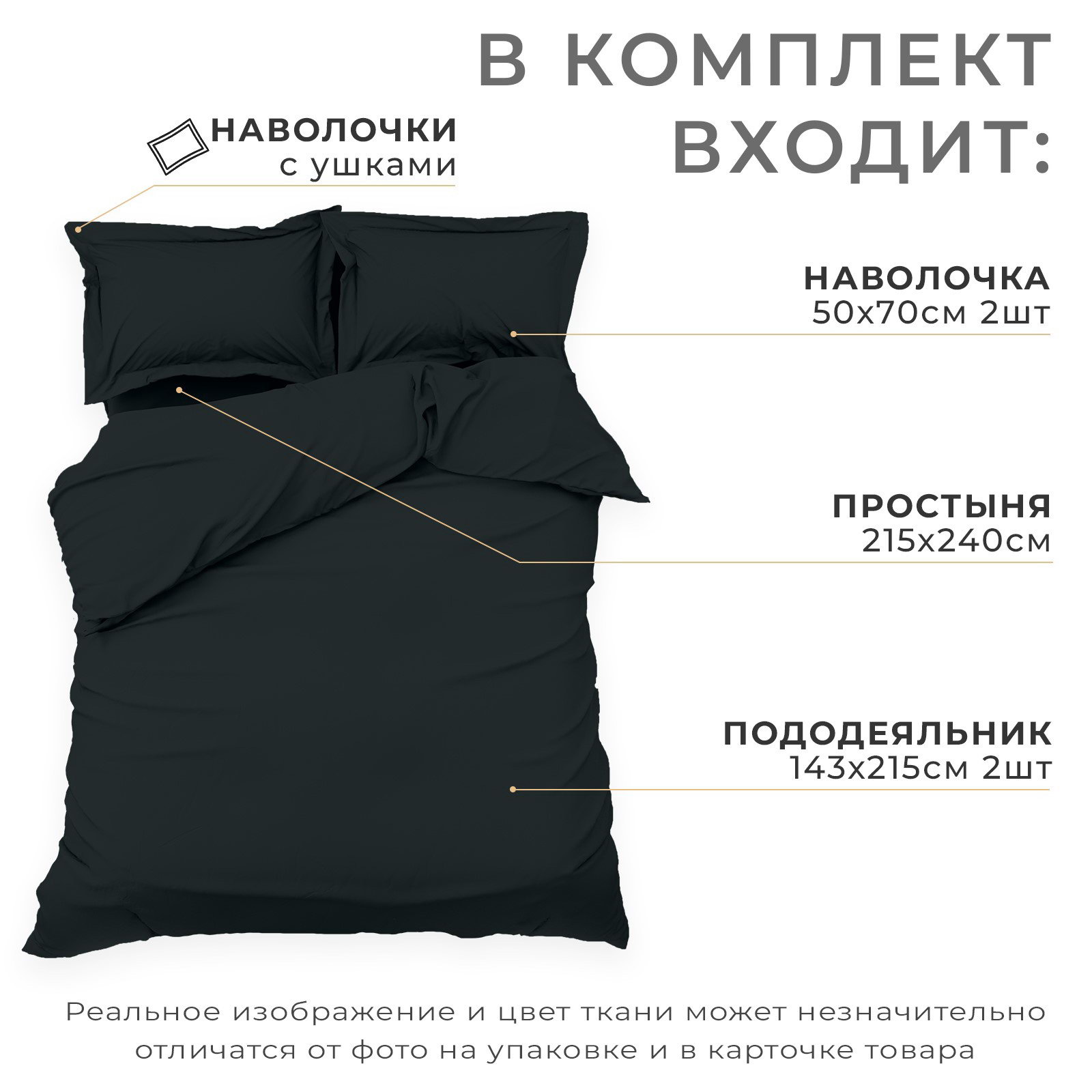 Комплектация: 2 наволочки, 2 пододеяльника, Простыня Рекомендации по уходу: Барабанная сушка при низкой температуре, Глажка при 150 ℃, Деликатная стирка при 40 ℃, Не отбеливать Декоративные элементы: Без декора, Без элементов Сезон: Весна, Зима, Лето, Осень Размер упаковки: 30 x 8 x 30 см. Размер упаковки: 30 x 8 x 30 см. tnved: 6302210000 Размер наволочки, см: 50 x 70 Размер простыни, см: 215 x 240 Размер: Семейное (дуэт) см Состав ткани: Хлопок Размер пододеяльника, см: 143 x 215 Назначение: Взрослым Вид застёжки пододеяльника: Без застёжки Вид застёжки наволочки: Клапан Количество наволочек: 2 Тематика: Однотонная Честный знак: Да Особенности простыни: Стандартная Температурное ограничение: Нет Цвет: Чёрный Ткань: Мако-сатин Фактура материала: Гладкий На резинке: Нет Плотность, г/?2: 114 Простыня в комплекте: Да Вид упаковки: PVC-пакет | ||