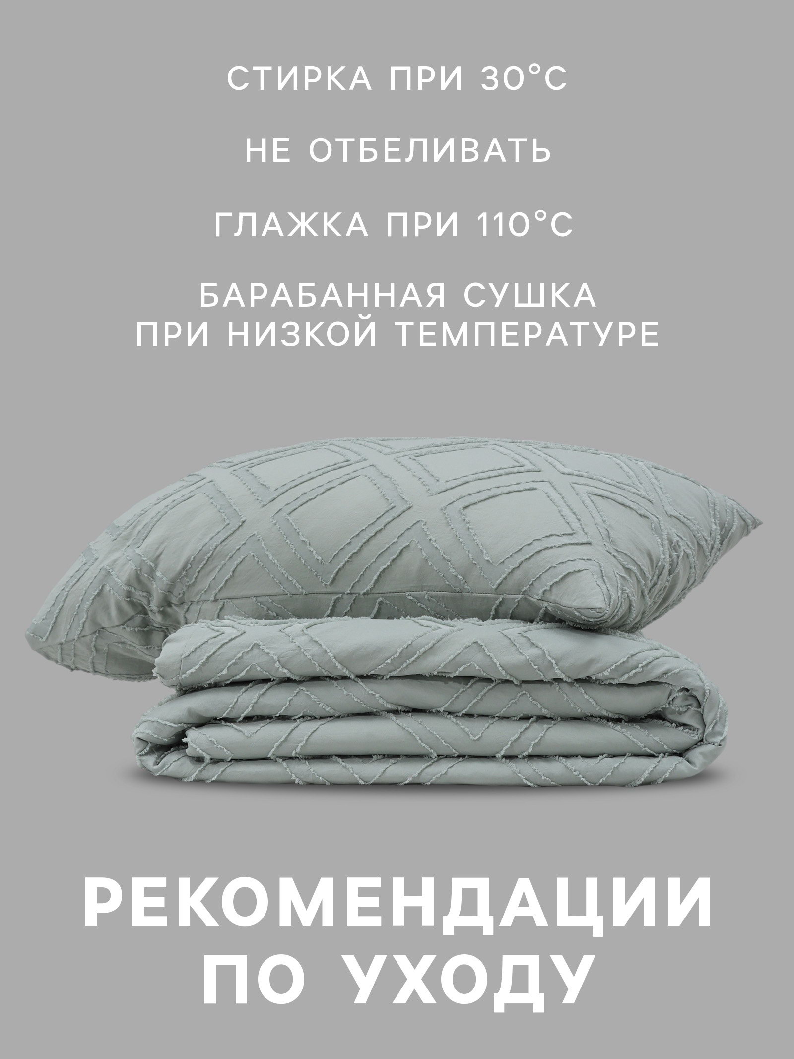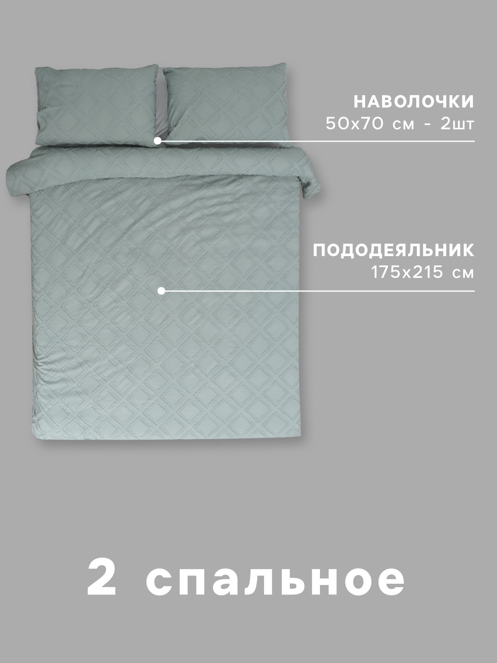 Комплектация: 2 наволочки, Пододеяльник Сезон: Весна, Зима, Лето, Осень Рекомендации по уходу: Барабанная сушка при низкой температуре, Глажка при 110 ℃, Не отбеливать, Стирка при 30 ℃ Размер упаковки: 30 x 7 x 30 см. tnved: 6302229000 Честный знак: Да Температурное ограничение: Нет Плотность, г/?2: 110 Простыня в комплекте: Нет Размер: 2-спальное см Размер пододеяльника, см: 175 x 215 Состав ткани: Полиэстер Количество наволочек: 2 Тематика: Однотонная Размер наволочки, см: 50 x 70 Ткань: Микрофибра Вид застёжки наволочки: Клапан Цвет: Зелёный Вид застёжки пододеяльника: Без застёжки Декоративные элементы: Тафтинг Вид упаковки: PVC-коробка Назначение: Взрослым Вид застёжки: Клапан На молнии: Нет | ||
