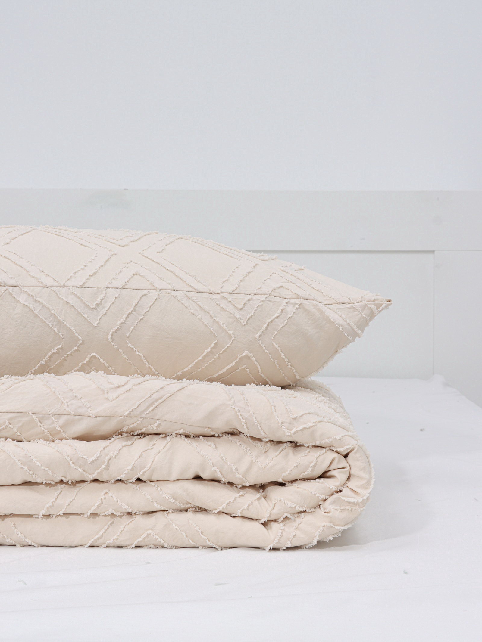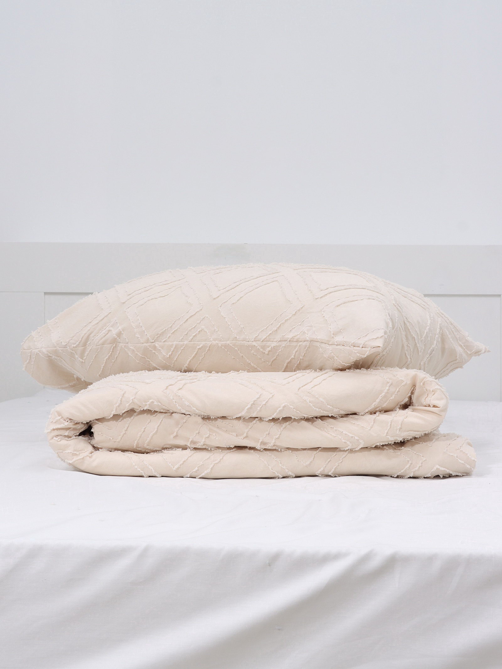 Рекомендации по уходу: Барабанная сушка при низкой температуре, Глажка при 110 ℃, Не отбеливать, Стирка при 30 ℃ Комплектация: 2 наволочки, Пододеяльник Сезон: Весна, Зима, Лето, Осень Размер упаковки: 30 x 9 x 30 см. tnved: 6302229000 Честный знак: Да Температурное ограничение: Нет Простыня в комплекте: Нет Размер пододеяльника, см: 200 x 217 Состав ткани: Полиэстер Размер: Евро см Размер наволочки, см: 50 x 70 Количество наволочек: 2 Вид застёжки наволочки: Клапан Цвет: Бежевый Вид застёжки пододеяльника: Без застёжки Декоративные элементы: Тафтинг Ткань: Микрофибра Плотность, г/?2: 110 На молнии: Нет Вид упаковки: PVC-коробка Вид застёжки: Клапан Тематика: Однотонная Назначение: Взрослым Преобразите свою спальню в оазис комфорта и тепла с нашим бежевым евро комплектом постельного белья с тафтингом "Ромб". Мягкая микрофибра и изысканный дизайн подарят вам незабываемые ощущения во время сна. Почему этот комплект постельного белья станет вашим лучшим выбором: