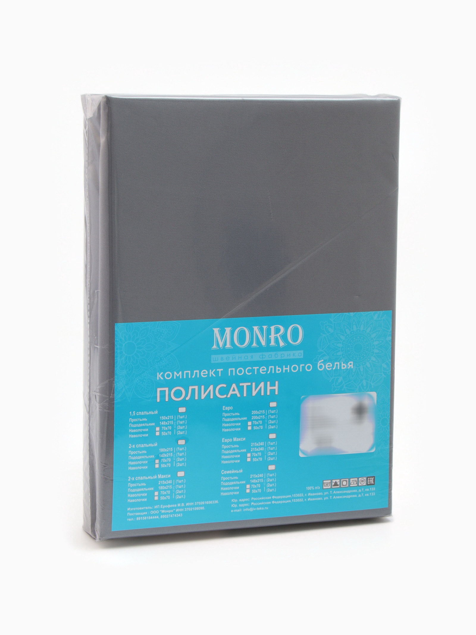 Рекомендации по уходу: Барабанная сушка при низкой температуре, Глажка при 110 ℃, Не отбеливать, Стирка при 30 ℃ Комплектация: Наволочка, Пододеяльник, Простыня Размер упаковки: 25 x 5 x 34 см. tnved: 6302229000 Температурное ограничение: Нет Вид застёжки наволочки: Клапан Размер наволочки, см: 70 x 70 Количество наволочек: 1 Простыня в комплекте: Да Вид застёжки пододеяльника: Без застёжки На резинке: Нет Вид упаковки: PVC-коробка Размер простыни, см: 150 x 215 Размер: 1.5-спальное см Цвет: Серый Размер пододеяльника, см: 148 x 215 Декоративные элементы: Без элементов Тематика: Однотонная Состав ткани: Полиэстер Назначение: Взрослым Особенности простыни: Стандартная Ткань: Полисатин Серое 1,5-спальное постельное бельё из полисатина практичное решение для современной спальни. Ткань с мягким блеском приятна к телу, не требует сложного ухода и долго сохраняет привлекательный вид. В комплекте: пододеяльник, простыня и наволочка всё необходимое для комфортного сна. Особенности