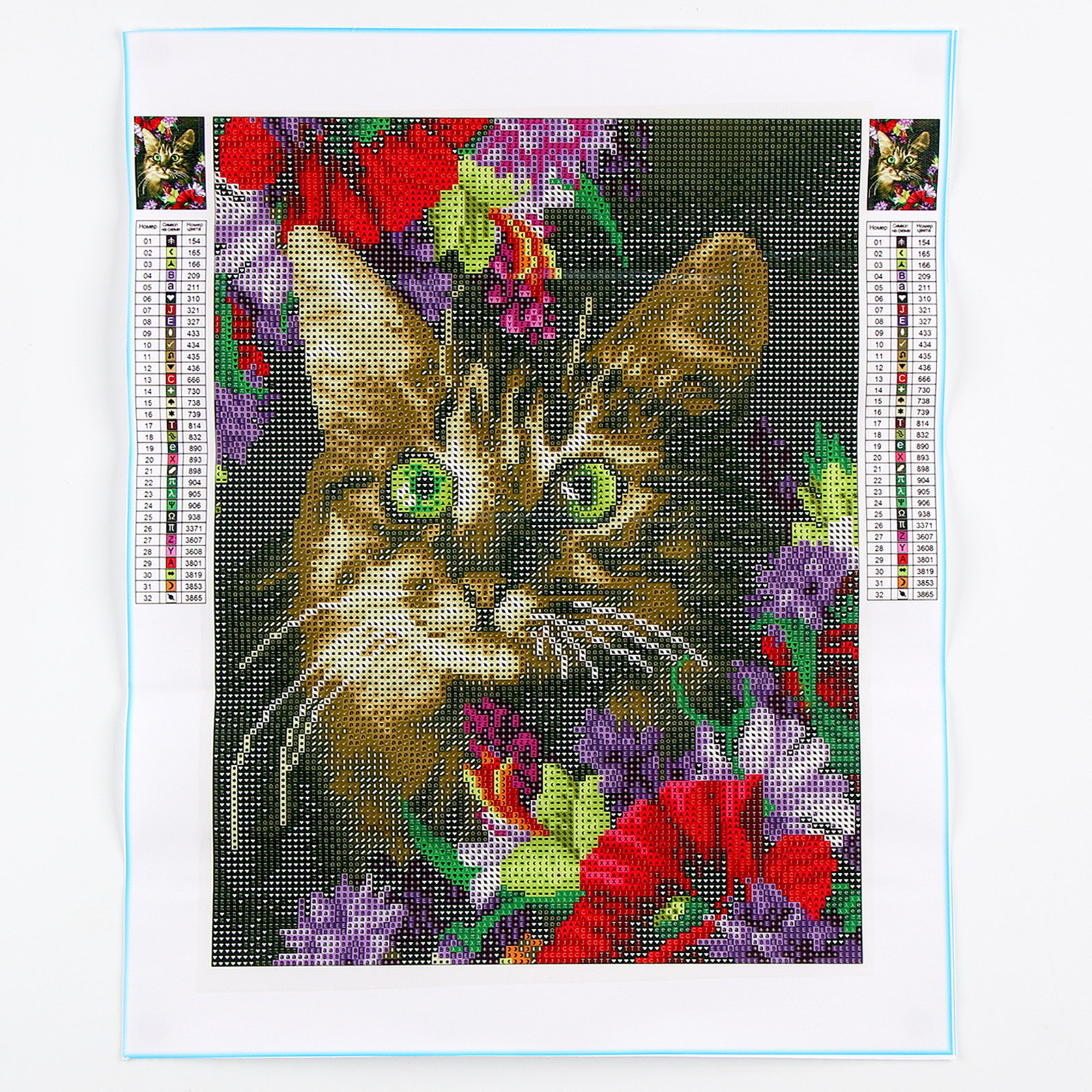 Алмазная мозаика с полным заполнением "Кот в цветах" 30х40 см, холст, ёмкость, 23.7x40x3.5 см., Школа талантов, Китай