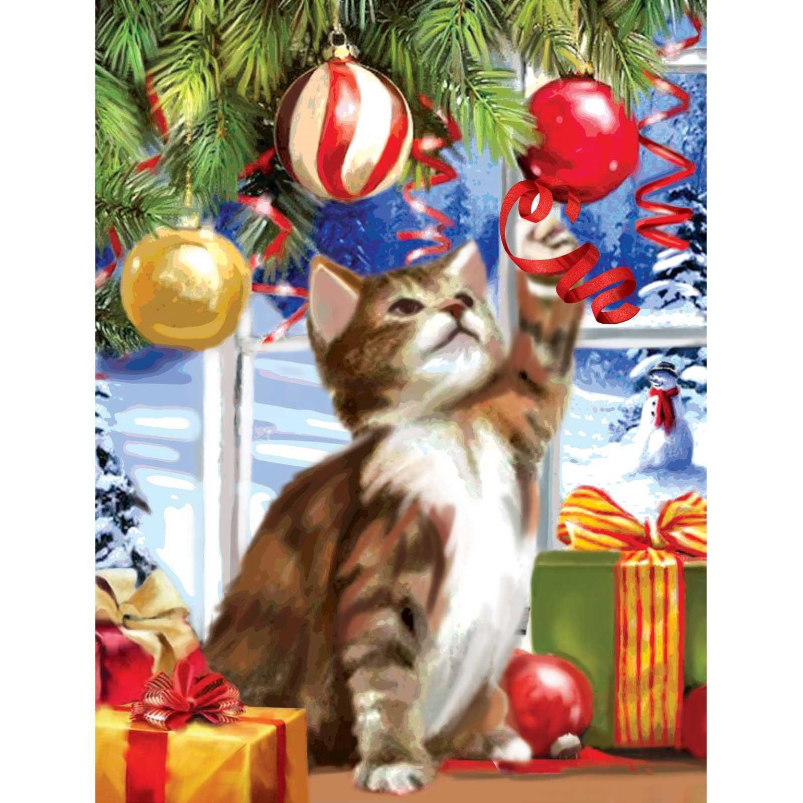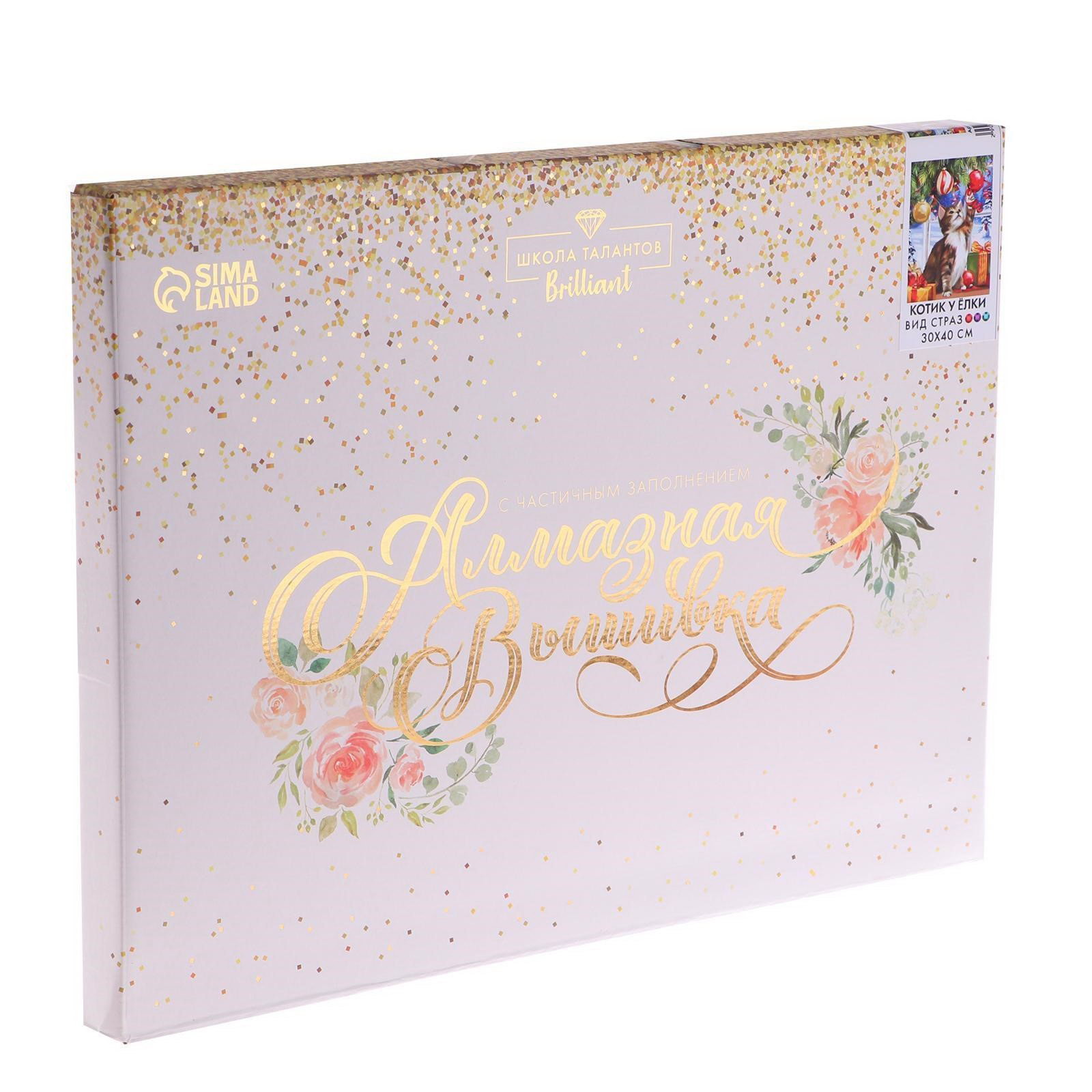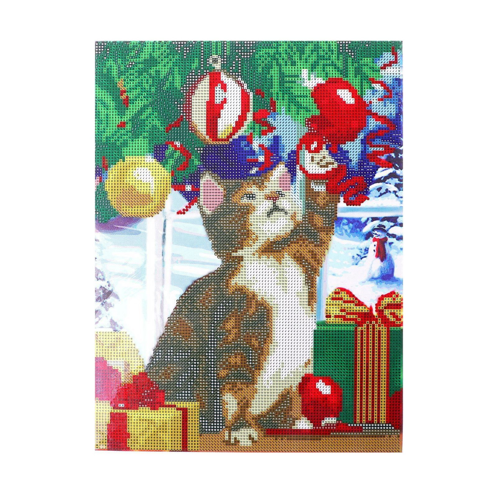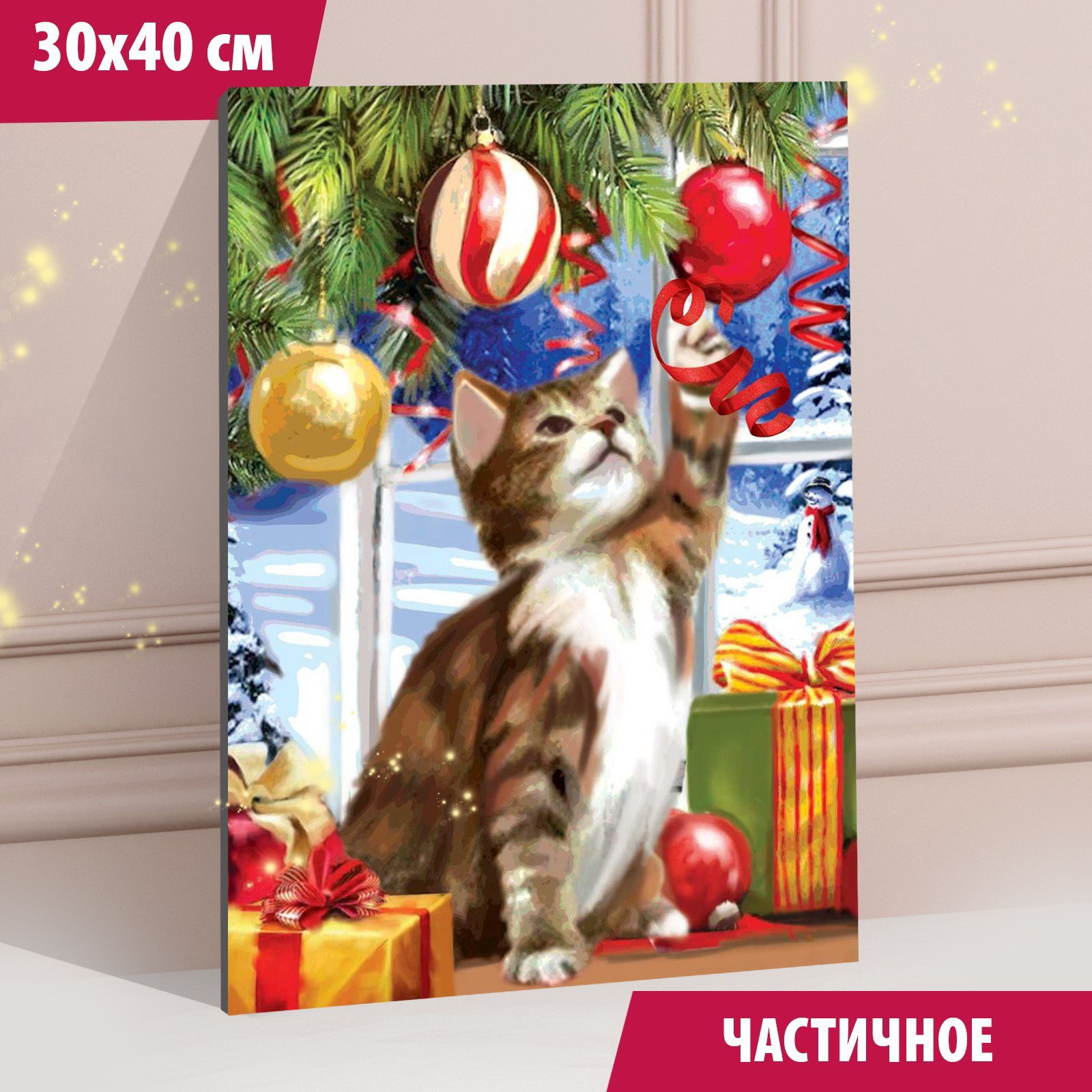 Алмазная мозаика на новый год с частичным заполнением на подрамнике "Котик у ёлки", 30x40 см, набор для творчества, 31x41x3 см., Школа талантов, Китай