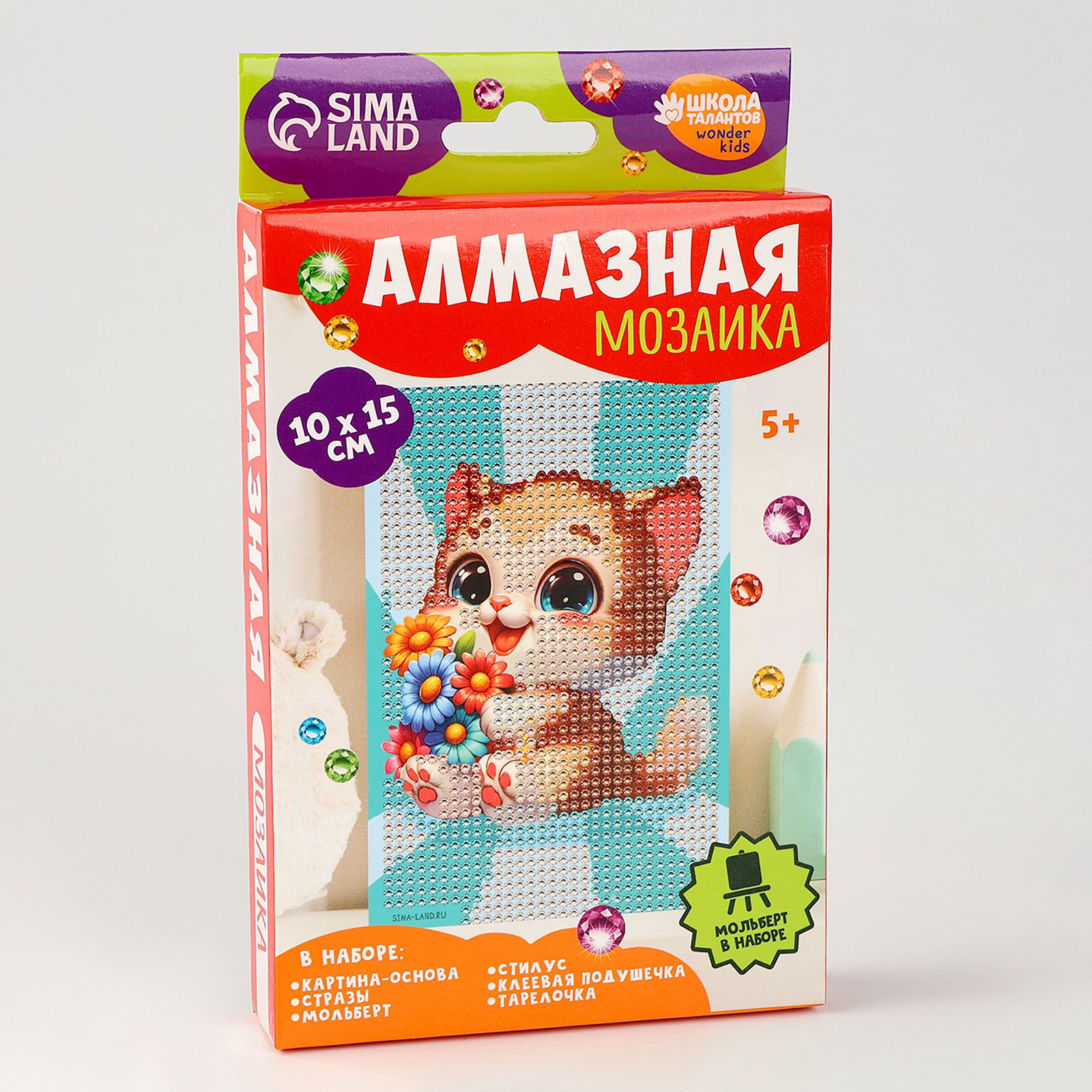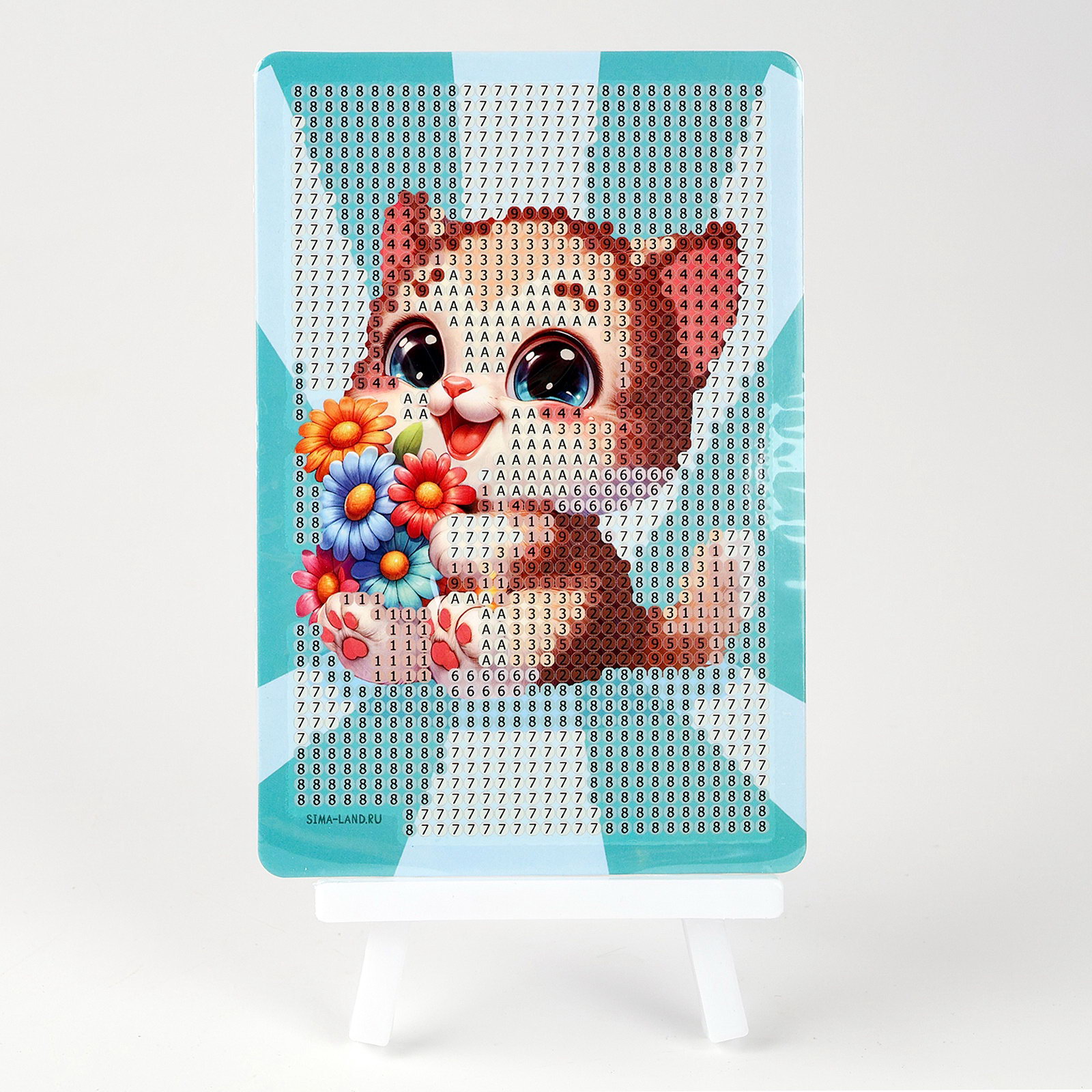 Алмазная мозаика с частичным заполнением на подставке для детей "Котёнок с букетом", 10x15 см, набор для творчества, 10.7x16.2x2.5 см., Школа талантов, Китай