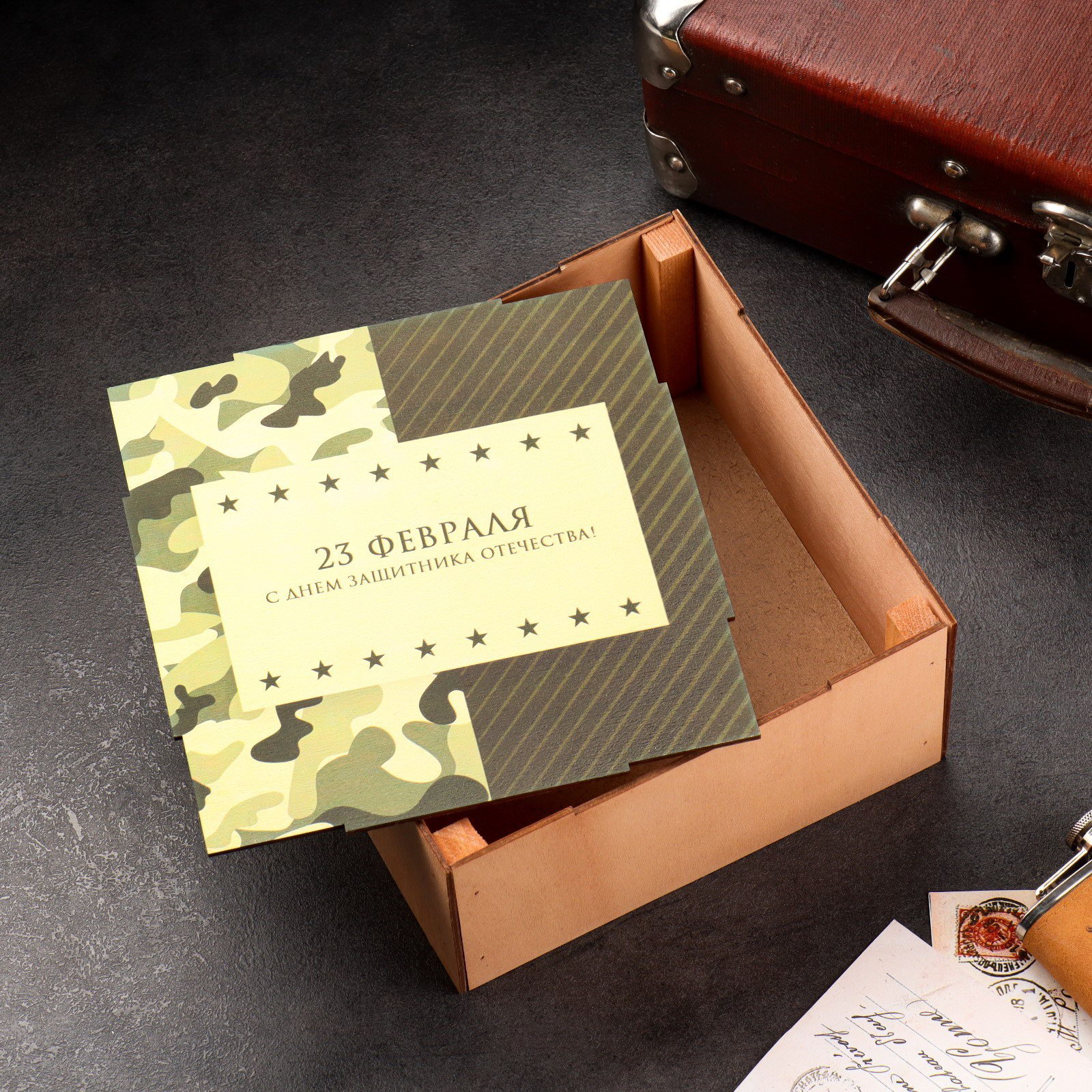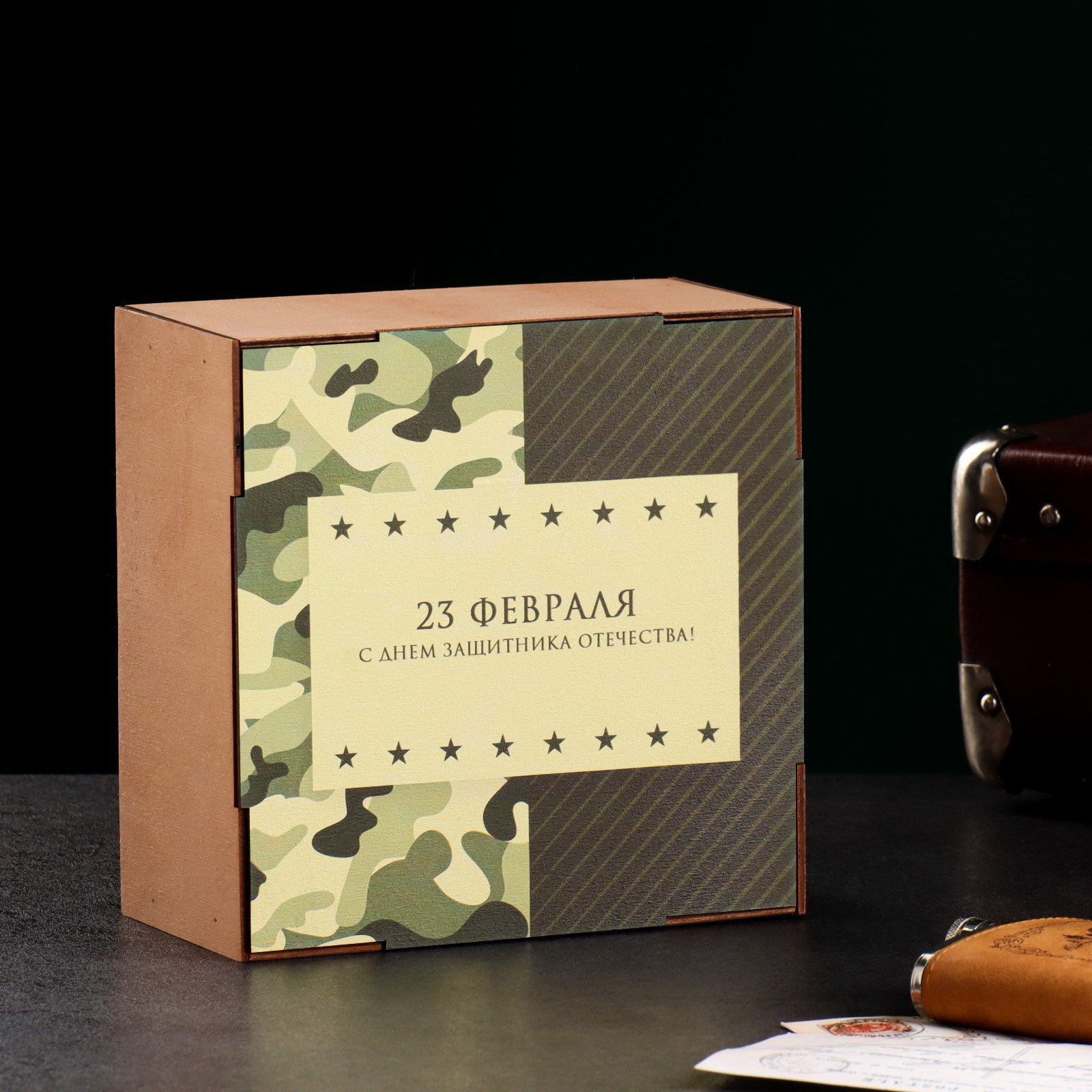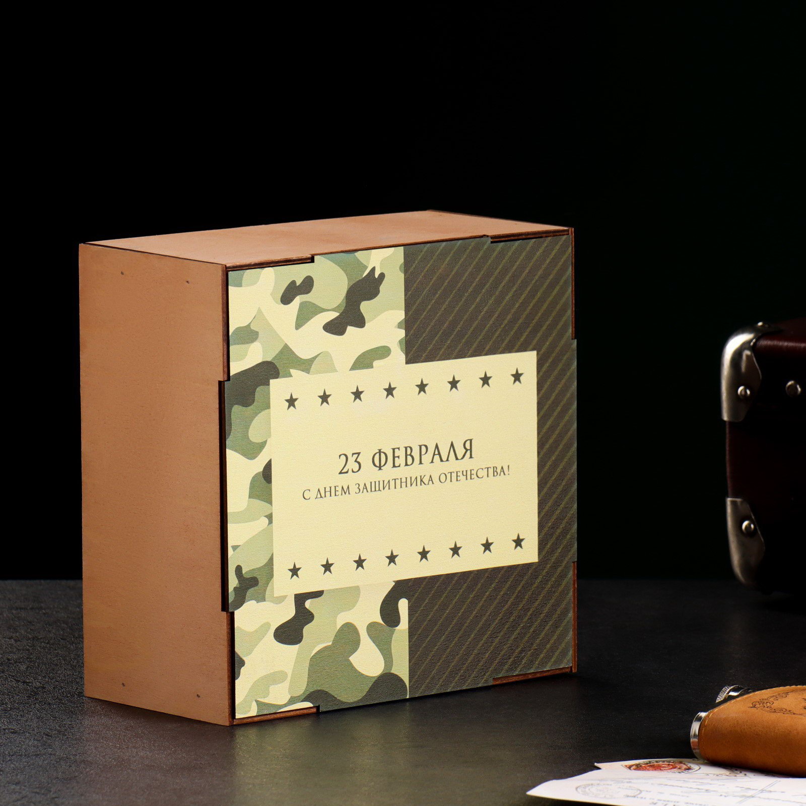Подарочная коробка "23 Февраля", 20x20x10 см, деревянная, хаки, Дарим Красиво, Россия