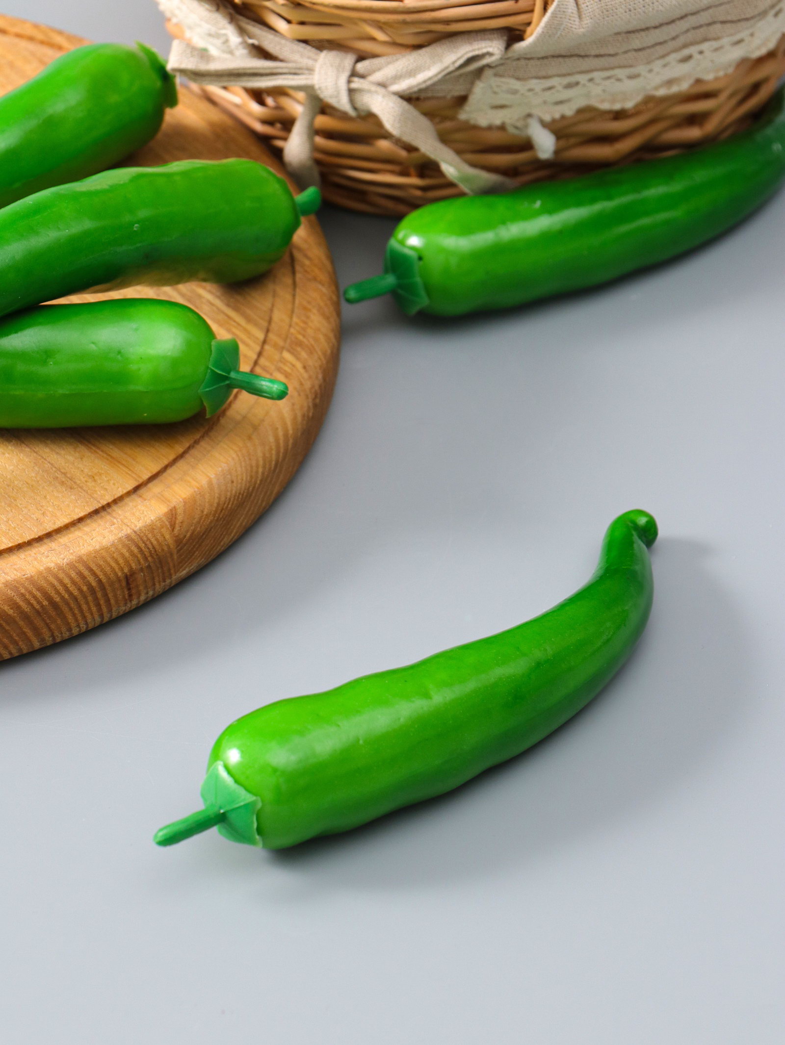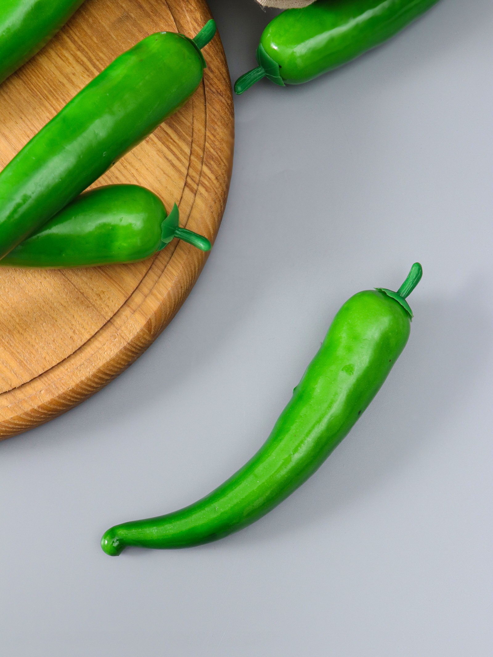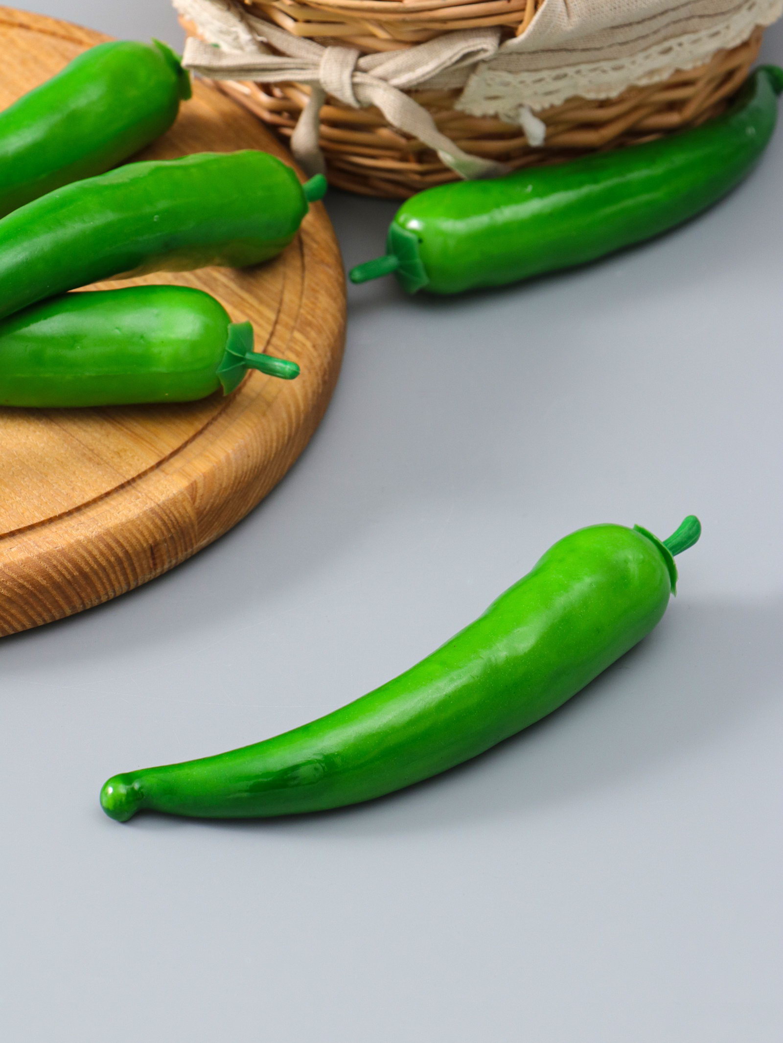 Размер упаковки: 3 x 3 x 18 см. tnved: 3926400000 Цвет: Зелёный Идеальный тренажёр для кухонного юмора и детективных сцен! Муляж острого перца длиной 18 см – это реалистичная имитация, которая добавит изюминку в интерьер, фотосессию или театральную постановку. Его насыщенный зелёный цвет передаёт сочность только что сорванного стручка.