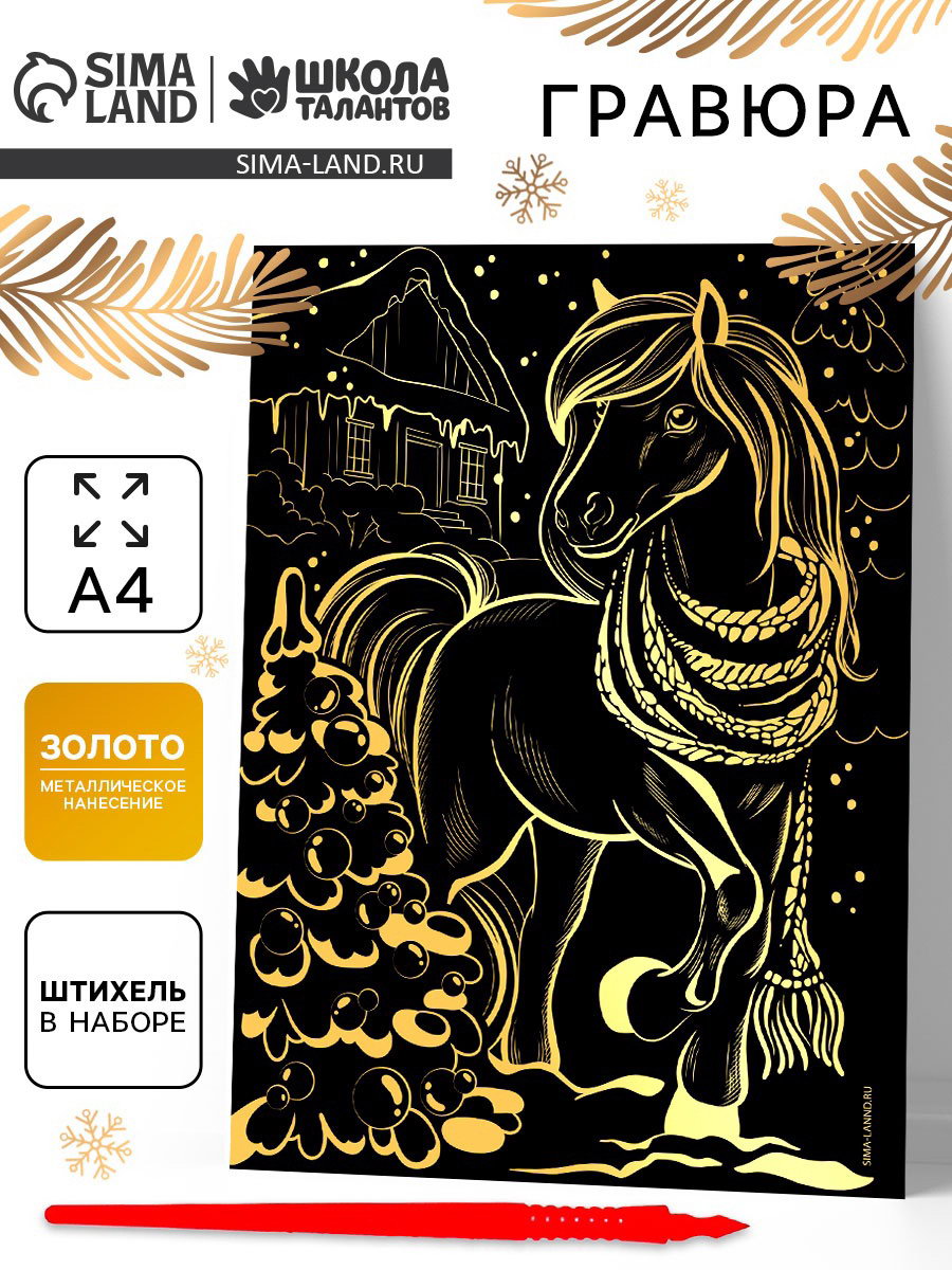 Гравюра "Лошадка" с золотым основанием, А4, 21.5x33x0.4 см., Школа талантов, Китай