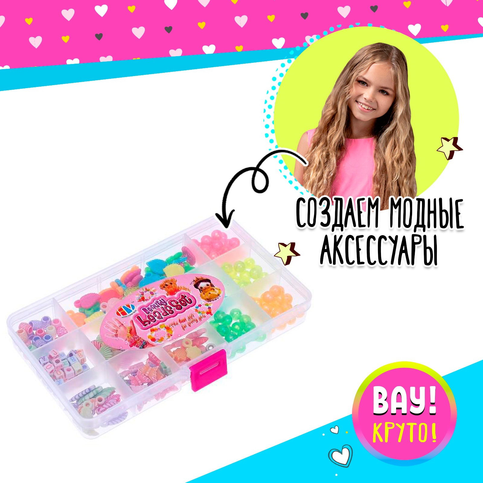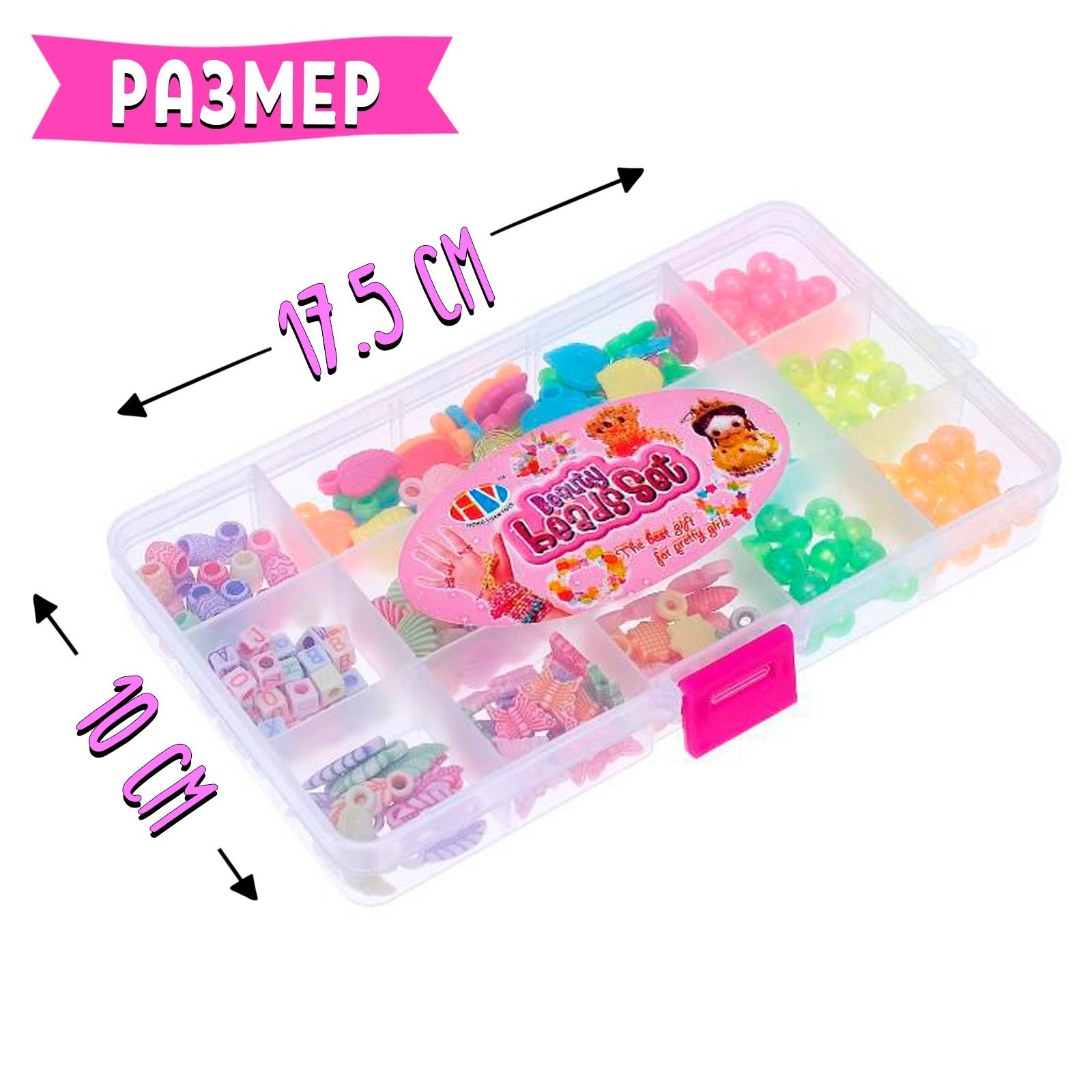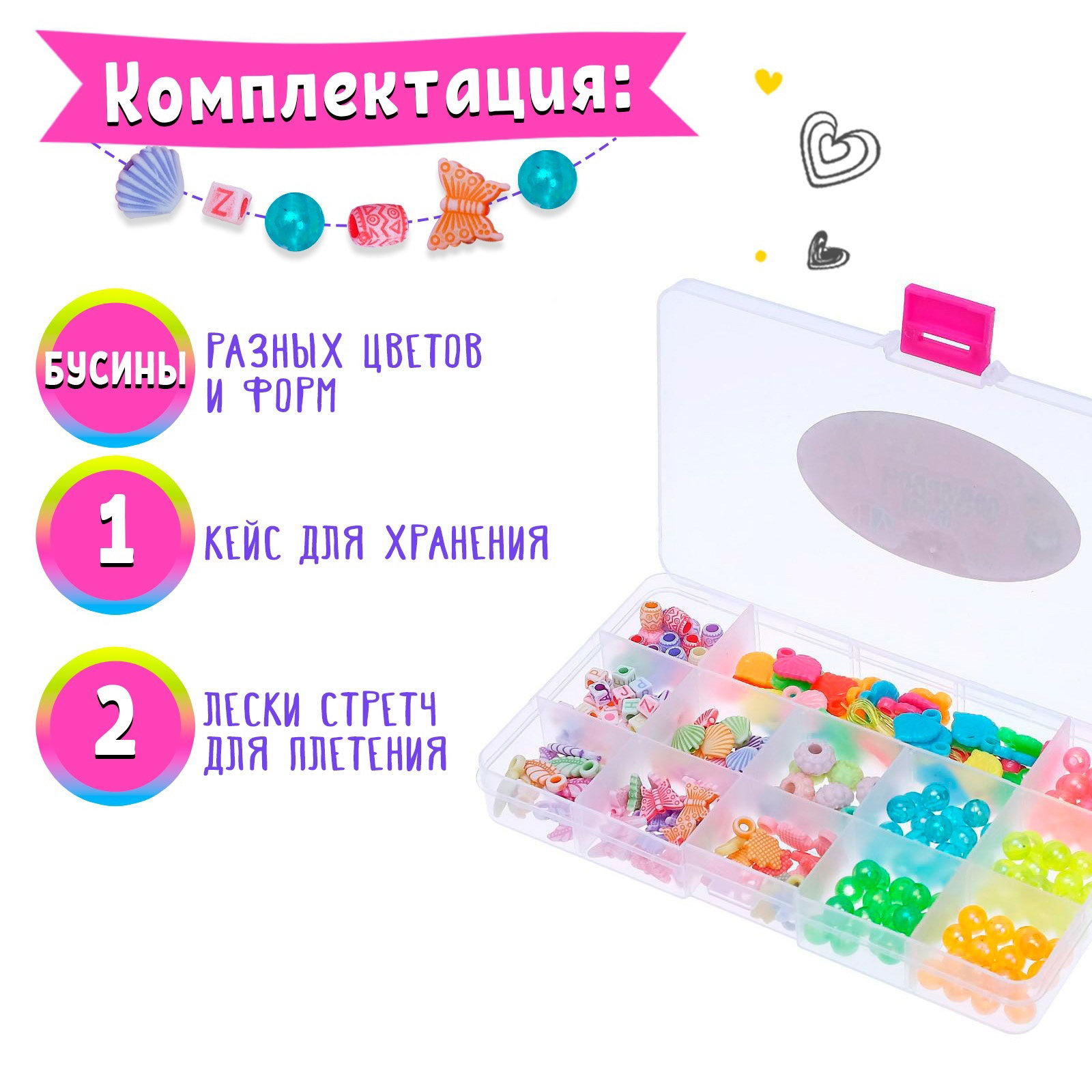 Для создания: Браслеты, Ожерелья, подвески, бусы Размер упаковки: 10.5 x 2.5 x 17.5 см. tnved: 3926909700 В комплекте: Бусины Вид: Набор украшений Возраст: От 5 лет Тематика: Стиль и красота Для кого: Для девочки Тематика праздника: 8 Марта Набор для создания украшений из бисера идеально подходит для тех, кто хочет развивать свои творческие способности и мастерить стильные аксессуары. Этот комплект включает в себя 13 видов бусинок, различных по форме и цвету, что позволяет воплощать в жизнь самые разные идеи и создавать уникальные украшения. Особенности