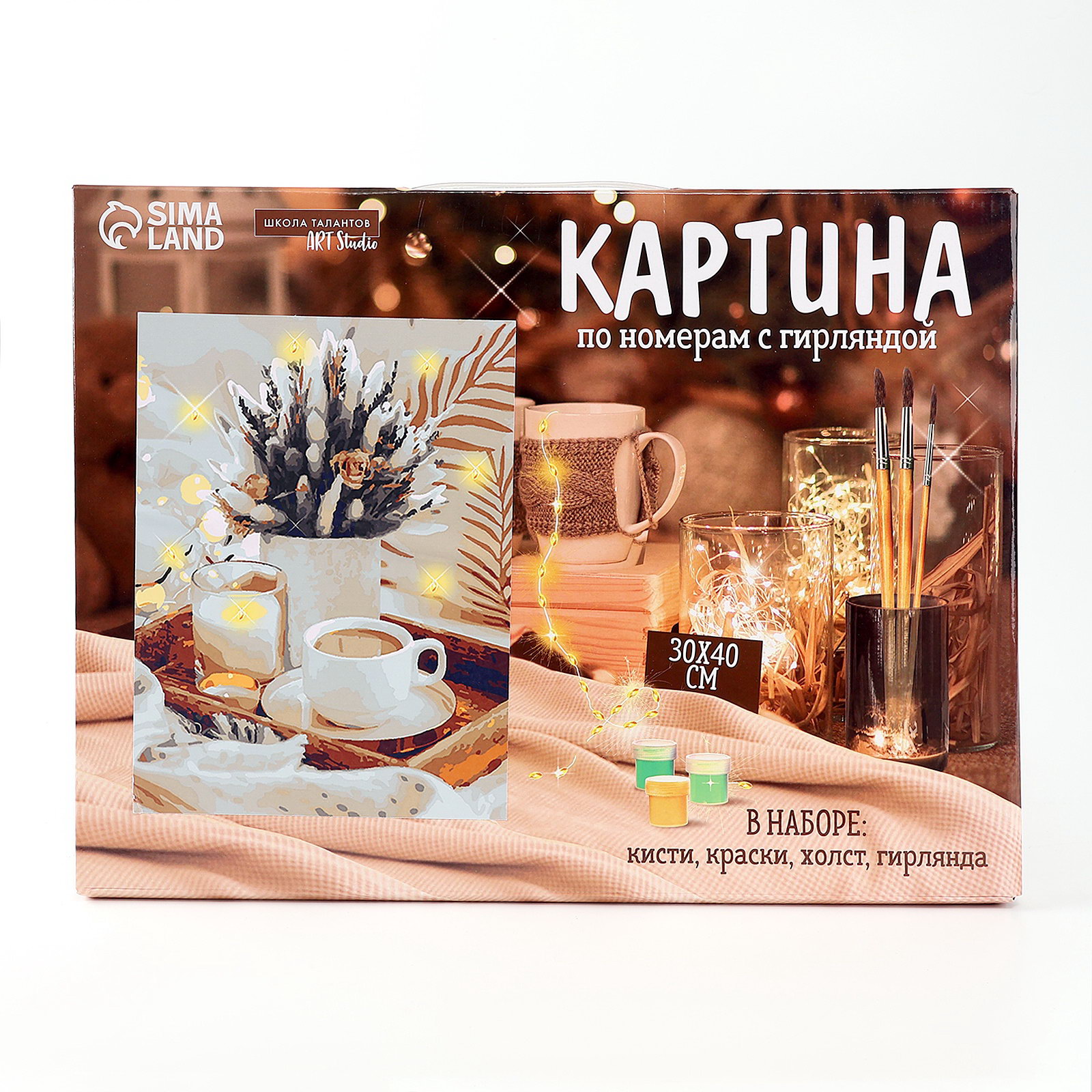 Картина по номерам на раме, с гирляндой "Кофе", 30х40 см, 31x41x2.4 см., Школа талантов, Китай