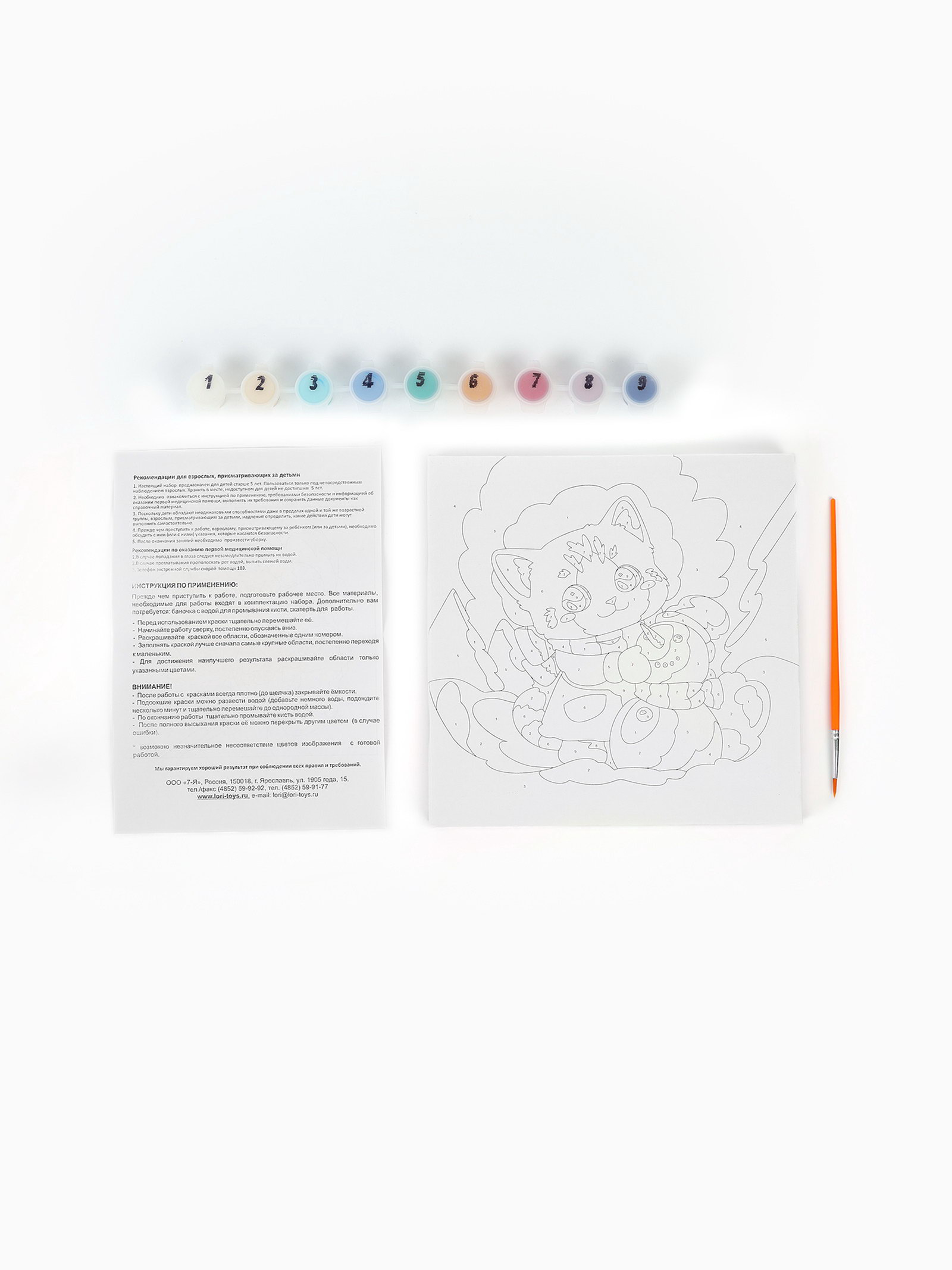 Комплектацияхолст - 20 x 20 см; акриловые краски - 9 цветов; кисть. | ||