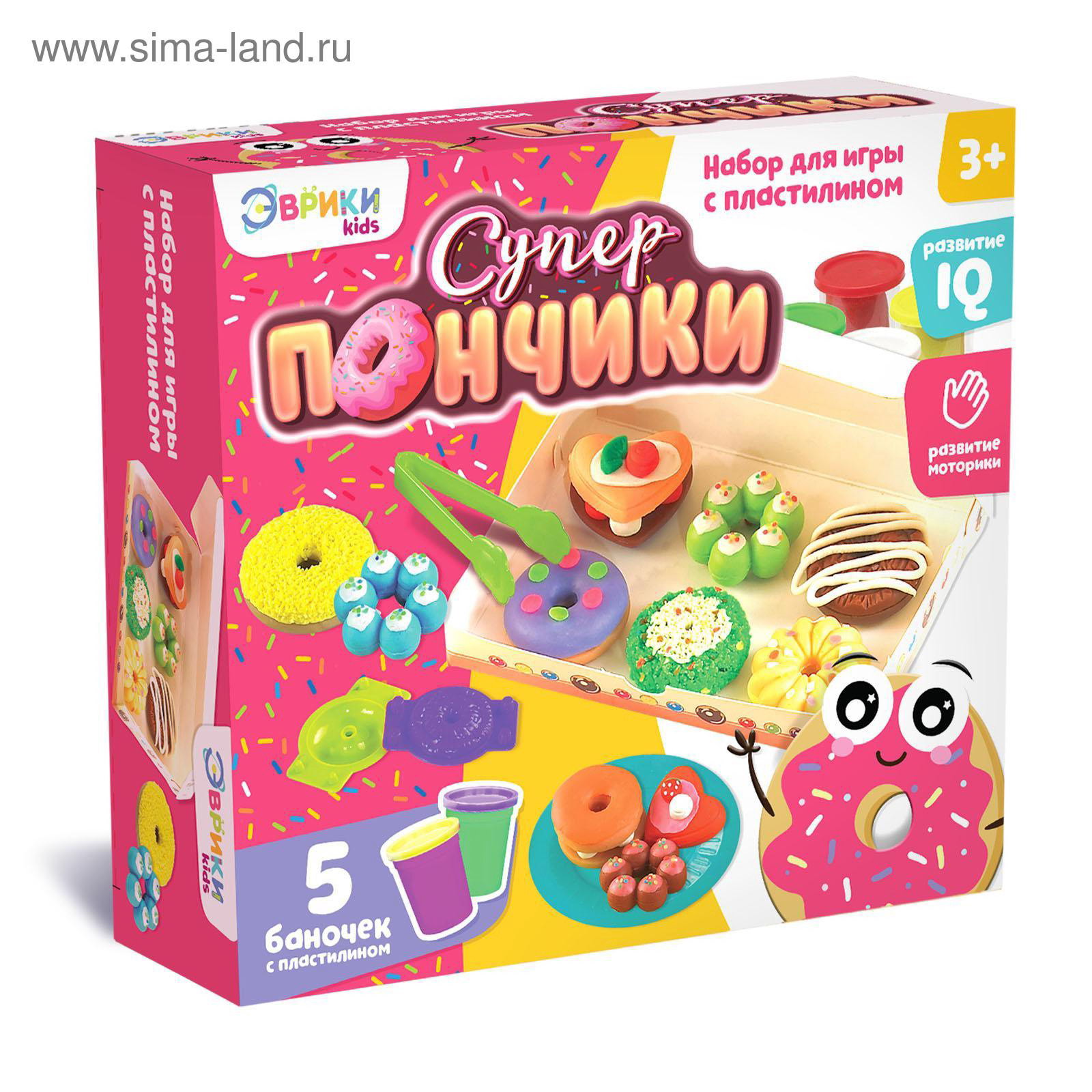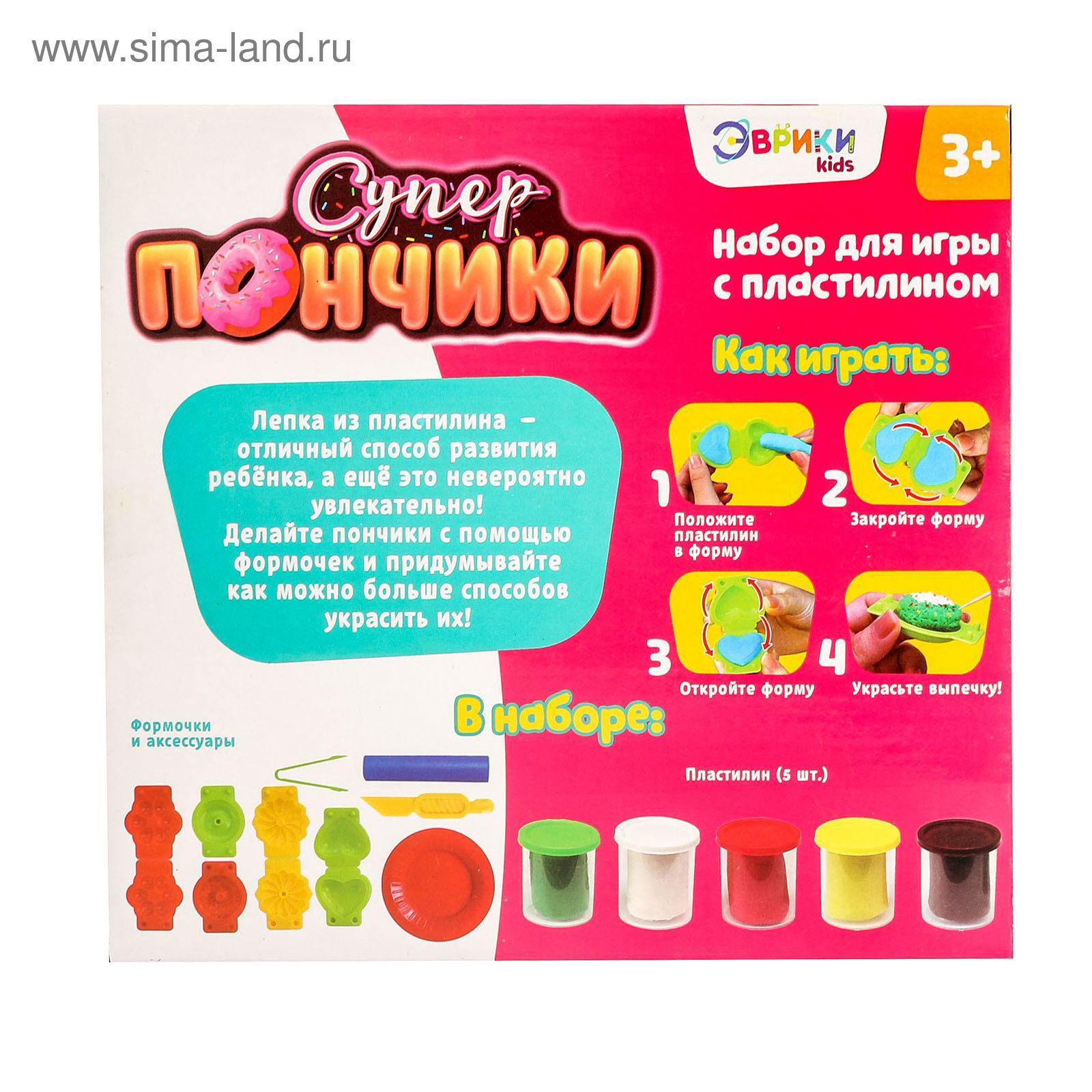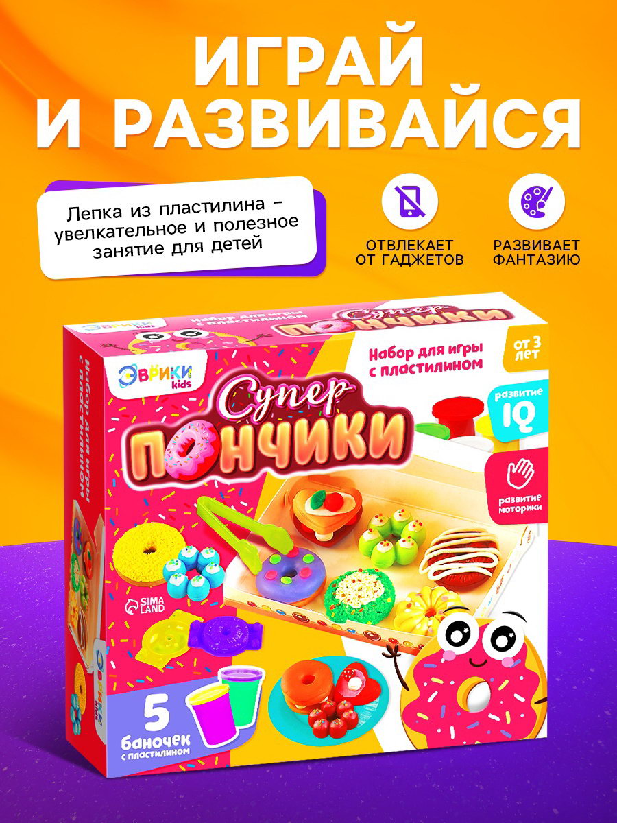 Размер упаковки: 6 x 18 x 19.5 см. Возраст: От 3 лет Вид итогового изделия: Настольная фигурка tnved: 9503007000 Материал для лепки: Пластилин Тематика набора: Лепка Для кого: Унисекс Игровой набор "Суперпончики" станет отличным выбором для творческих занятий с пластилином. Он поможет ребёнку придумать и "испечь" яркие угощения, развивая воображение и мелкую моторику. В комплект входят пять баночек разноцветного пластилина и инструменты для создания сладких шедевров. Что внутри?