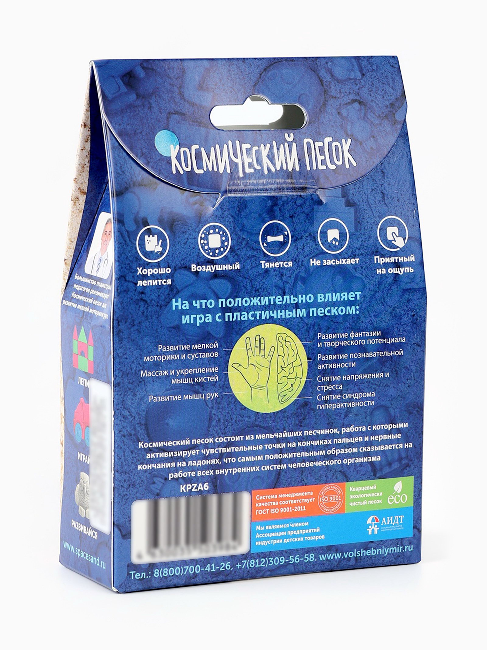 Размер упаковки: 10 x 15 x 4 см. tnved: 9503007000 Температурное ограничение: Нет Вес, кг: 150 Количество цветов: 1 Цвет: Голубой Возраст: От 3 лет Вид песка: Кинетический песок Вид упаковки: Картонная коробка с европодвесом Играть с космическим песком ребёнок сможет когда и где захочет. Материал не прилипает к рукам и легко убирается со всех поверхностей. А удобная упаковка позволяет компактно хранить песок и избегать его загрязнения. Неоспоримая польза песка для лепки: