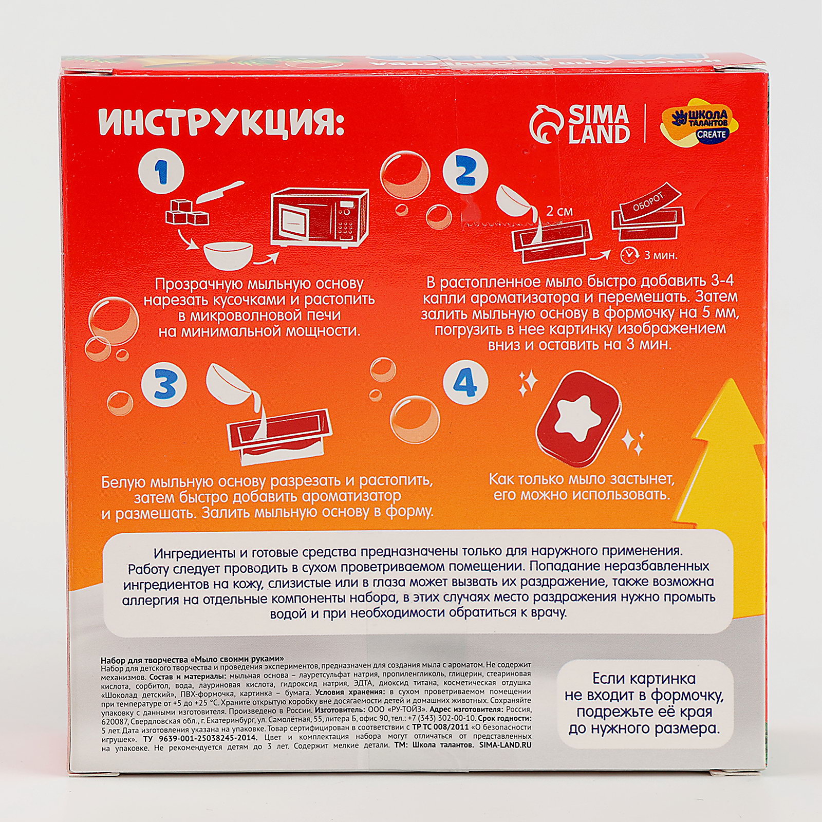 Размер упаковки: 12.5 x 4 x 12.5 см. Температурное ограничение: Нет Для кого: Унисекс Вид: Классическое мыло Возраст: От 3 лет Для создания: Мыла Составляющие набора: Товары для творчества tnved: 9503007000 Мыловарение это необыкновенное занятие, которое подарит положительные эмоции и поможет развить креативность, фантазию, мелкую моторику. С помощью этого набора вы сможете создать ароматное мыло своими руками. Как сделать мыло?