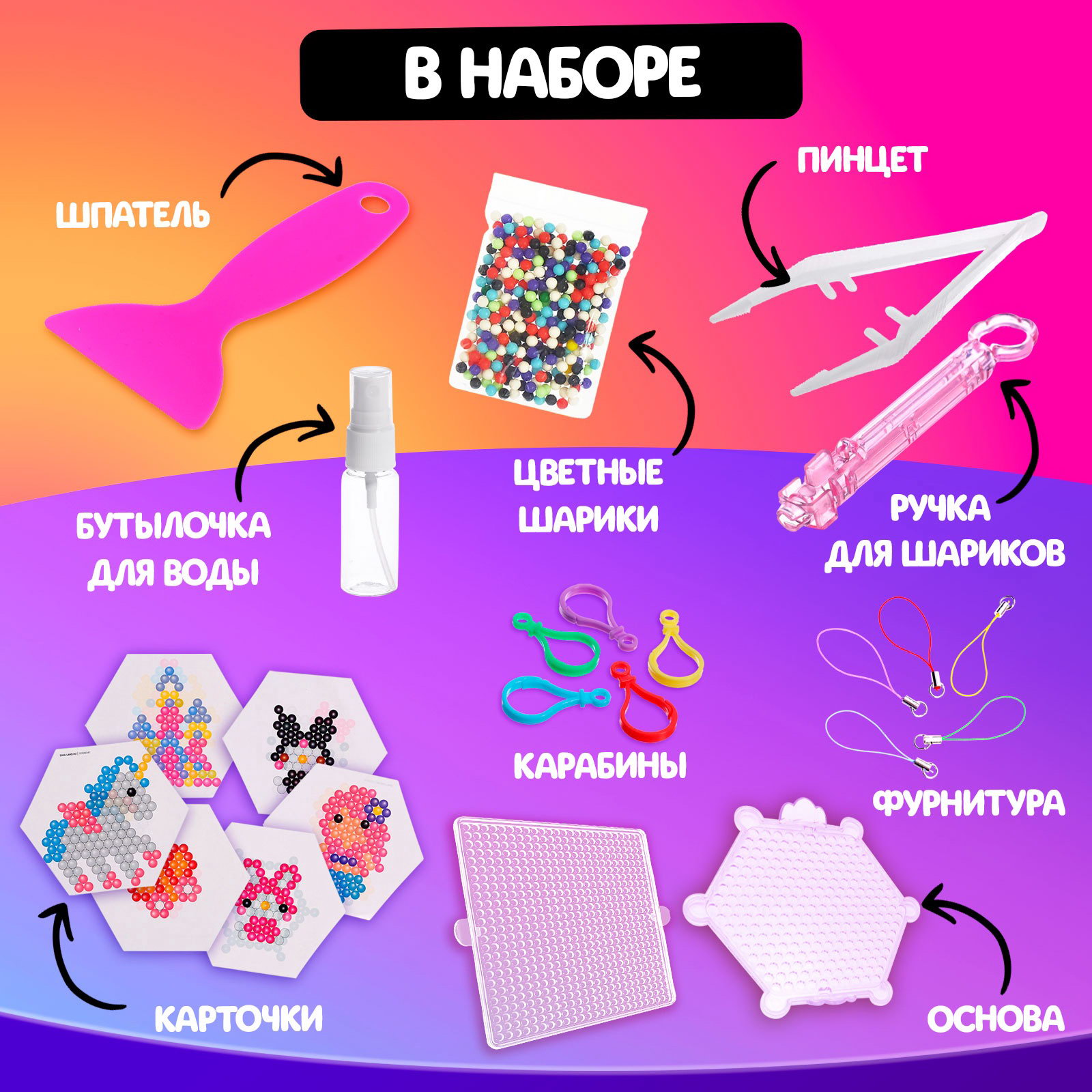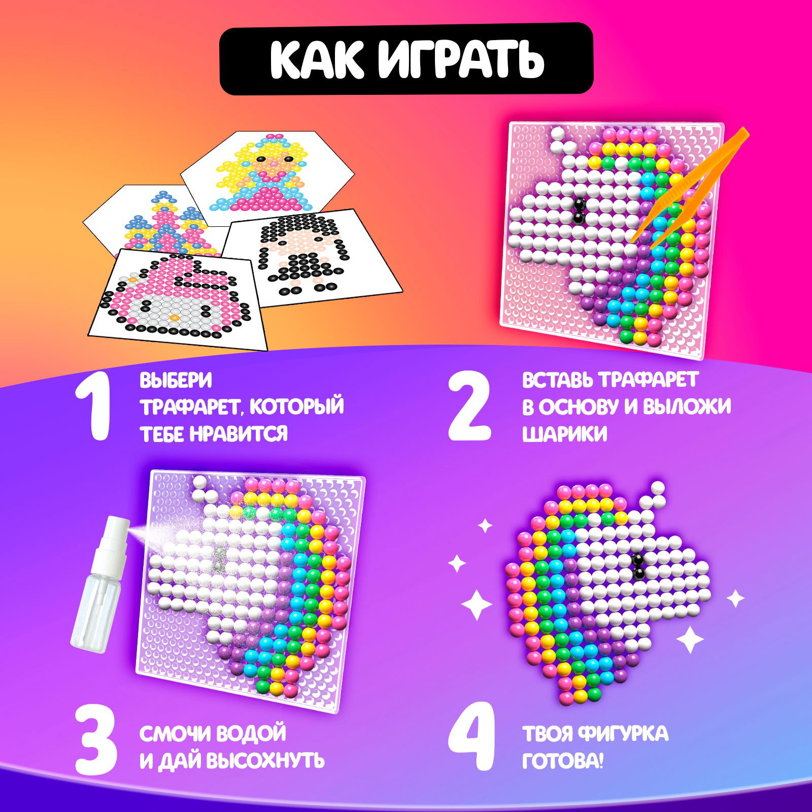 Польза занятий с аквамозаикой Игра с мозаикой развивает мелкую моторику, цветовое восприятие и усидчивость, позволяет ребёнку проявить креативность в удивительном процессе изготовления фигурки. Подходит для детей от 4 лет. | ||