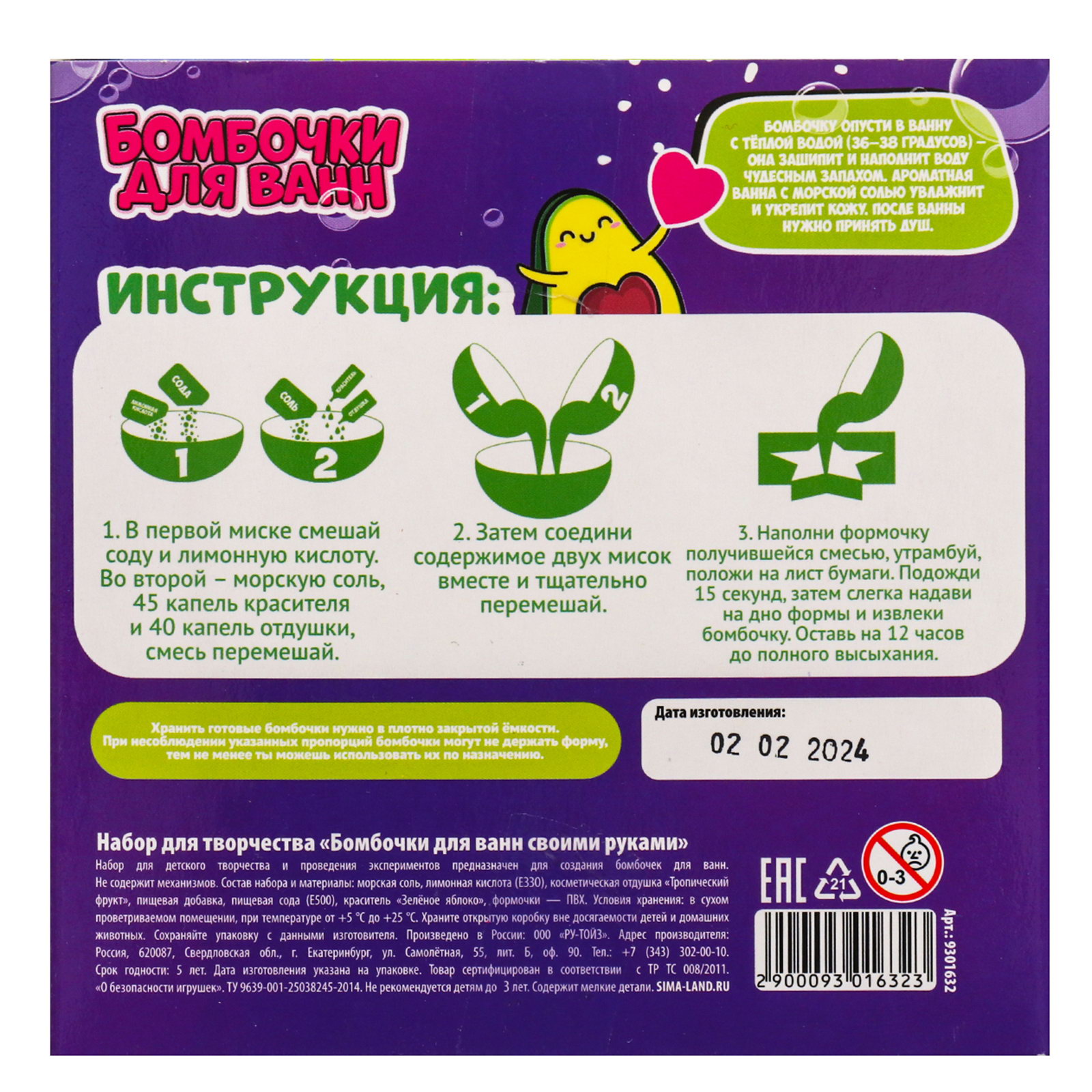 Размер упаковки: 15 x 4 x 13 см. Тематика праздника: Универсальная тематика Тематика: Еда Возраст: От 7 лет tnved: 9503007000 Температурное ограничение: Нет Для создания: Бомбочки Аромат: Тропический Перед вами не просто набор для творчества, а самое настоящее производство бомбочек для ванны в маленькой коробочке! Как сделать бомбочку?
