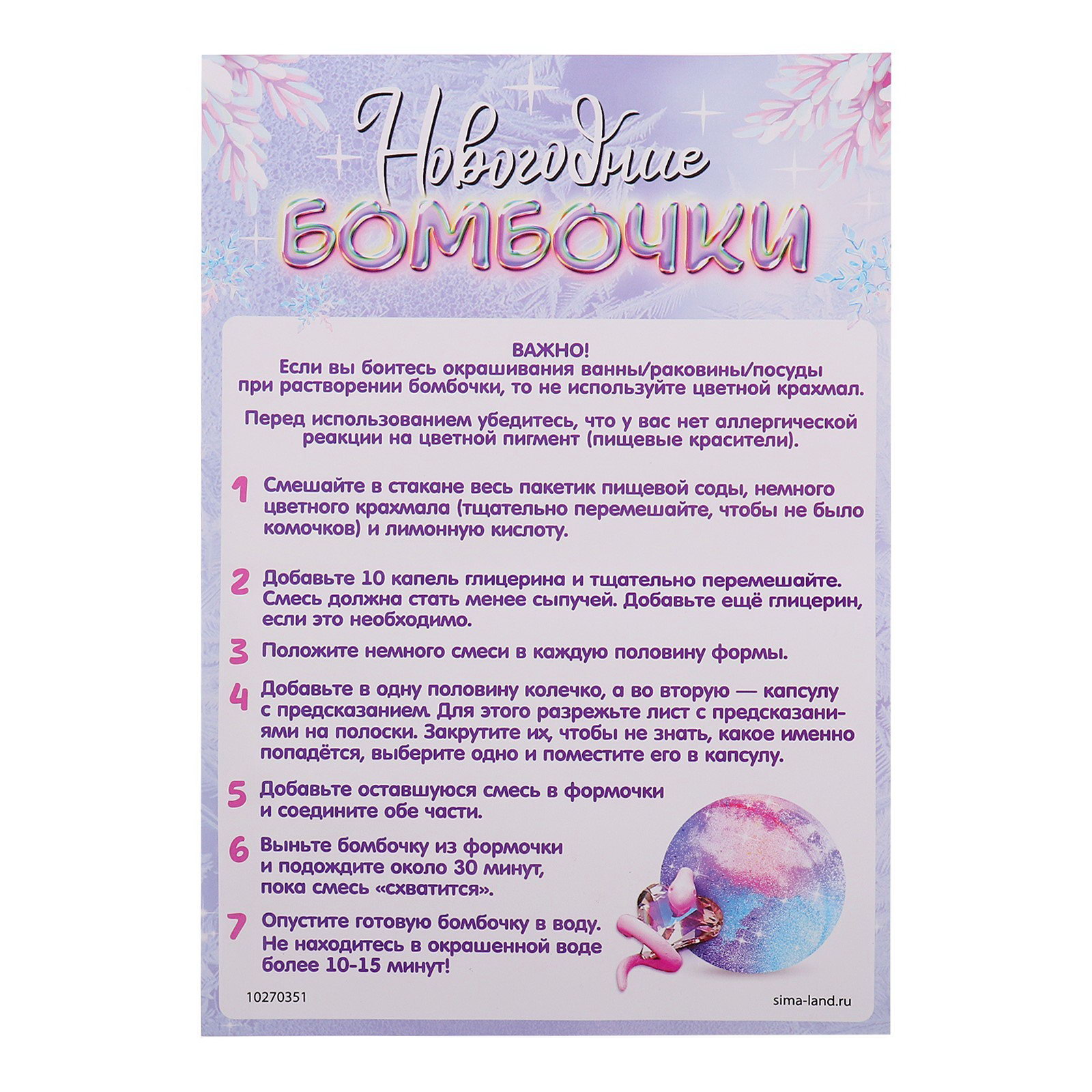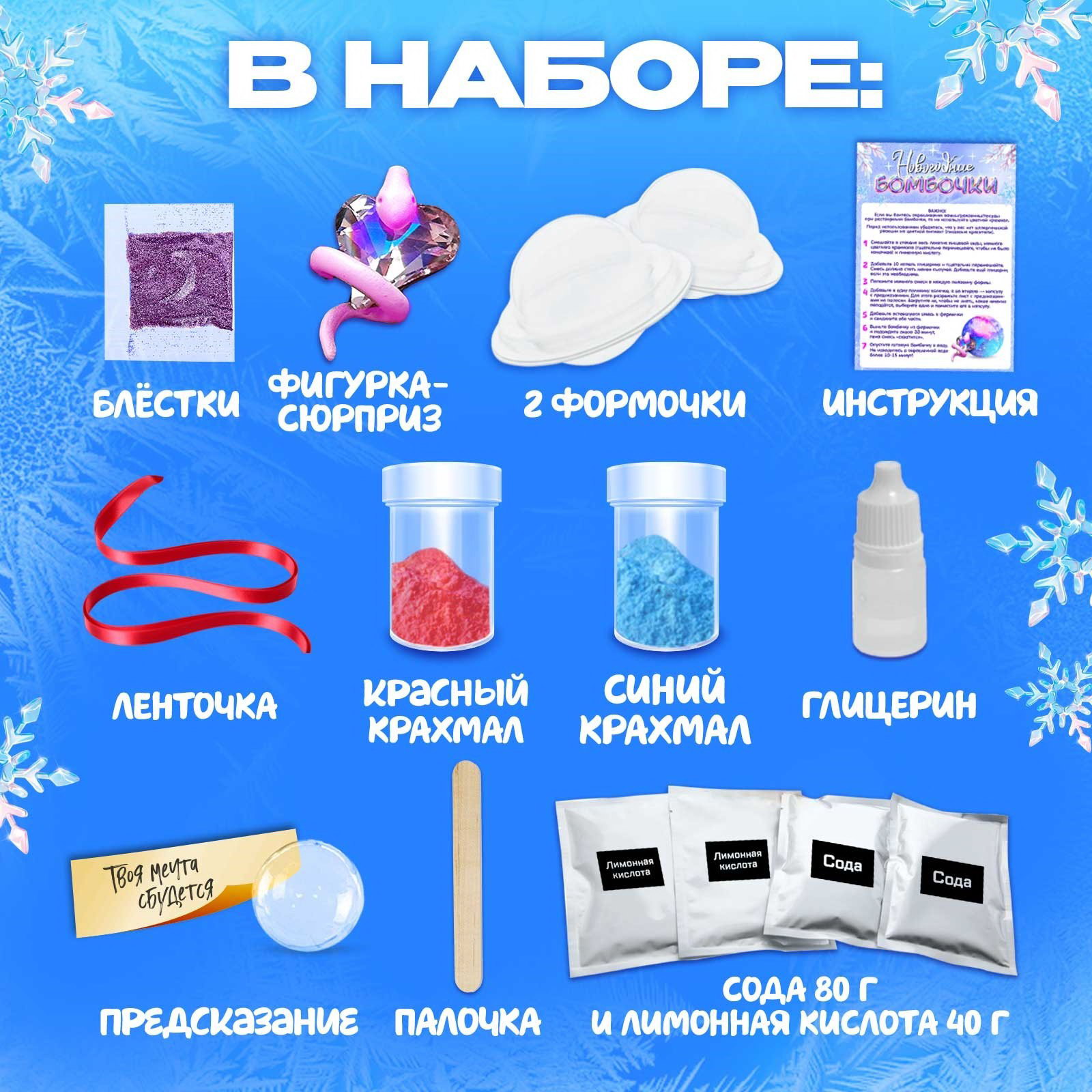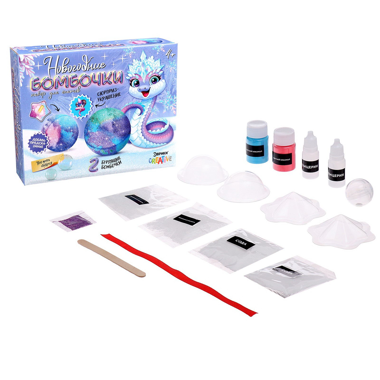 Размер упаковки: 5 x 15 x 18 см. Вид исследований: Опыты с реагентами Вид науки: Химия Количество опытов: 1 Возраст: От 4 лет Животное восточного календаря: Змея Для создания: Бомбочки Составляющие набора: Кольцо Тематика праздника: Новый год Тематика праздника: Новый год tnved: 9503007000 Набор для опытов "Новогодние бомбочки" это сочетание научного подхода и праздничного настроения. Такой подарок поможет ребёнку скрасить ожидание Нового года и создать две разноцветных бомбочки для ванны. Инструкция