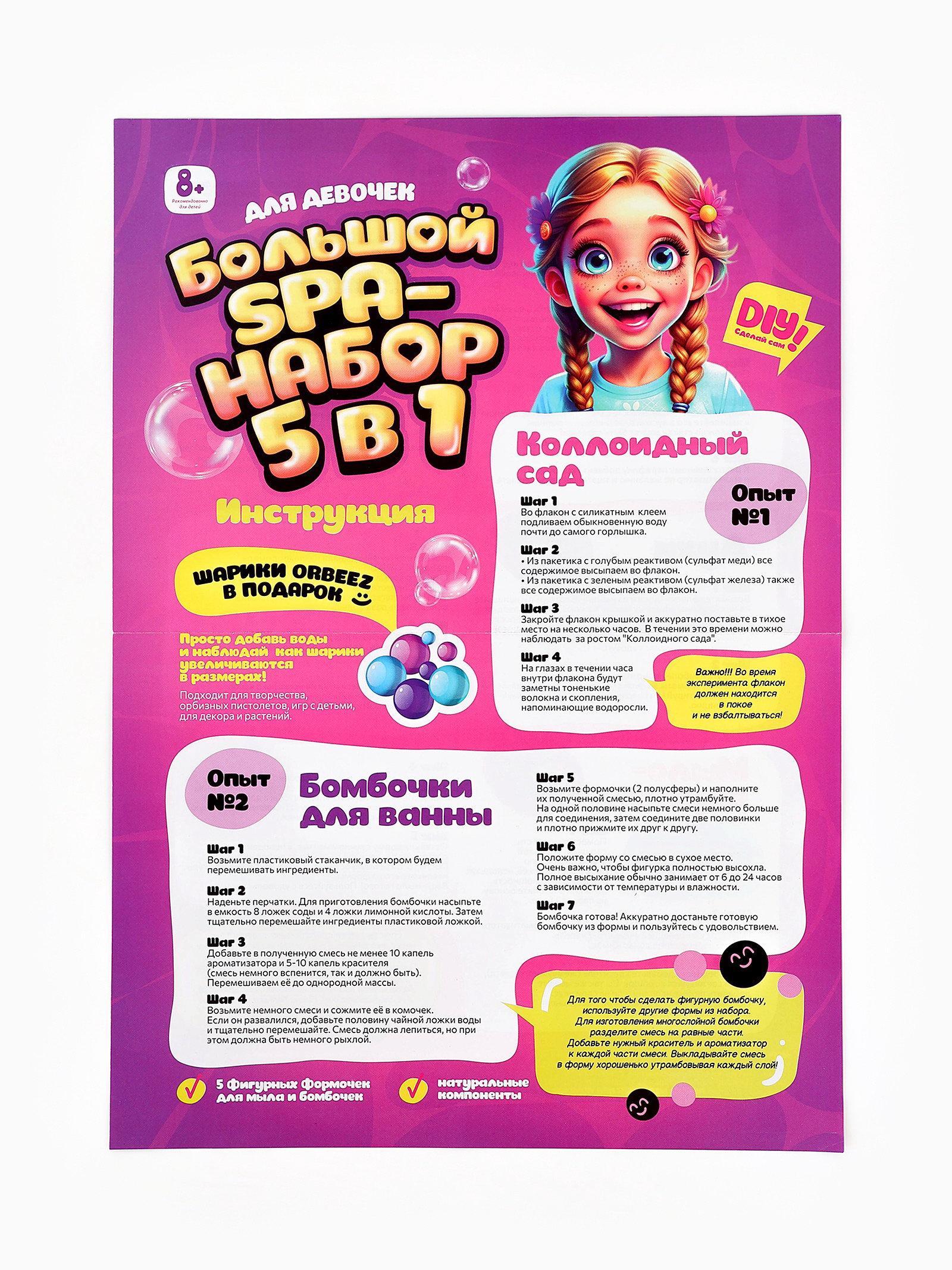 Тематика праздника: 8 Марта, Универсальная тематика Размер упаковки: 27.5 x 5.5 x 36 см. tnved: 9503007000 Температурное ограничение: Нет Возраст: От 8 лет Тематика набора: Опыты Погрузитесь в атмосферу творчества и ароматных экспериментов вместе с Большим SPA-набором. Он создан специально для девочек, которые мечтают создавать собственные ароматные и уходовые средства. Набор превращает простой процесс смешивания ингредиентов в увлекательную игру и помогает ребёнку почувствовать себя настоящим мастером. В набор входят всё необходимое для самостоятельного создания косметики и ароматов: можно приготовить бомбочки для ванны, нежное мыло, свечи и собственный парфюм. Каждый шаг это настоящий мини-лабораторный эксперимент: измерение, смешивание, отстаивание и оформление как у взрослых, но безопасно и доступно для ребенка. | ||