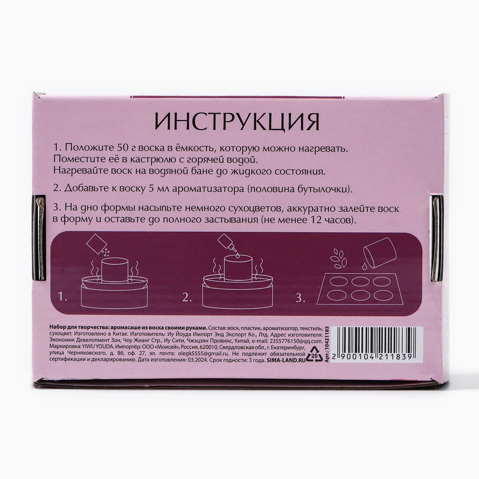 Аромат: Кедр, Сандал, Фиалка Возраст: Для взрослых, От 7 лет Размер упаковки: 12.5 x 8.5 x 5 см. Для создания: Аромасаше Для кого: Унисекс Вид итогового изделия: Аромасаше Материал для лепки: Воск Вид ароматизатора: Аромасаше tnved: 3406000000 tnved: 3406000000 Ароматическое саше - эстетичный и экологичный ароматизатор для одежды и небольших помещений. Саше придаст легкий и ненавязчивый аромат. В набор входит: Как сделать аромасаше: Восковое саше - это вечный аромакамень, который будет радовать Вас на протяжении полутора-двух месяцев, а после Вы можете нанести немного парфюма или несколько капель масла на любую сторону, и аромасаше будет продолжать радовать Вас ароматом. | ||