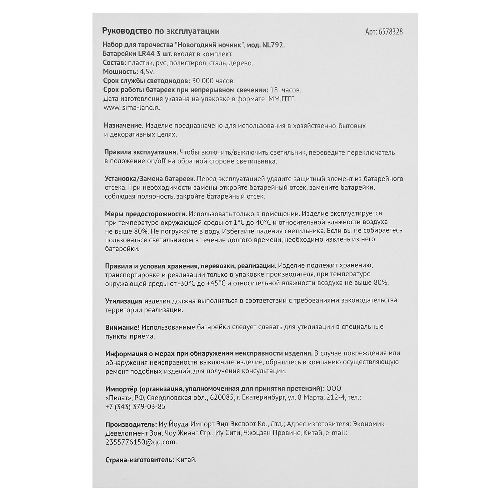 Размер упаковки: 12 x 6 x 17.5 см. Возраст: От 3 лет Возраст: От 3 лет tnved: 9405420000 Тематика праздника: Новый год Форма: Полуовальная Батарейки в комплекте: Да Типоразмер батареек: LR44 (V13GA, AG13, LR1154, SR44) Количество батареек: 3 Ночник добавит атмосферы тепла и уюта в доме, либо станет подарком для друзей и близких. Как сделать ночник?