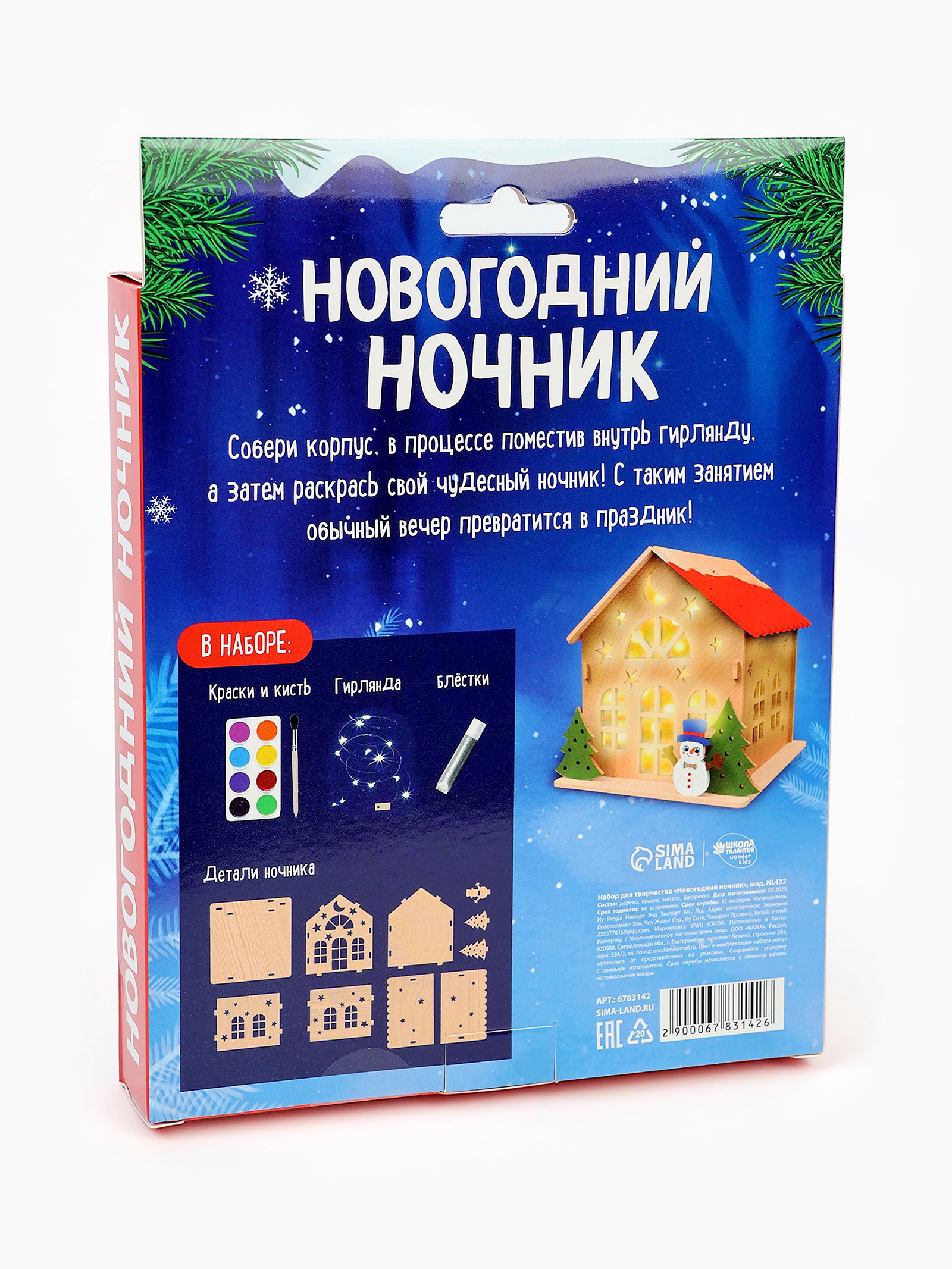Возраст: Любой, От 7 лет Размер упаковки: 17 x 4.5 x 21 см. Для создания: Ночники Составляющие набора: Товары для творчества tnved: 9405421000 Символ года: Нет Для кого: Унисекс Адресат: Без адресата Тематика праздника: Новый год Форма: Фигурная Изготовление ночника это увлекательное и простое занятие! Процесс создания поможет развить у малыша мелкую моторику, фантазию и воображение, а также подарит много радости от творческого процесса. Готовая поделка станет запоминающимся подарком для близких. В наборе: деревянные детали для домика, светодиодная гирлянда, краски, кисть, клей, инструкция. Как создать композицию