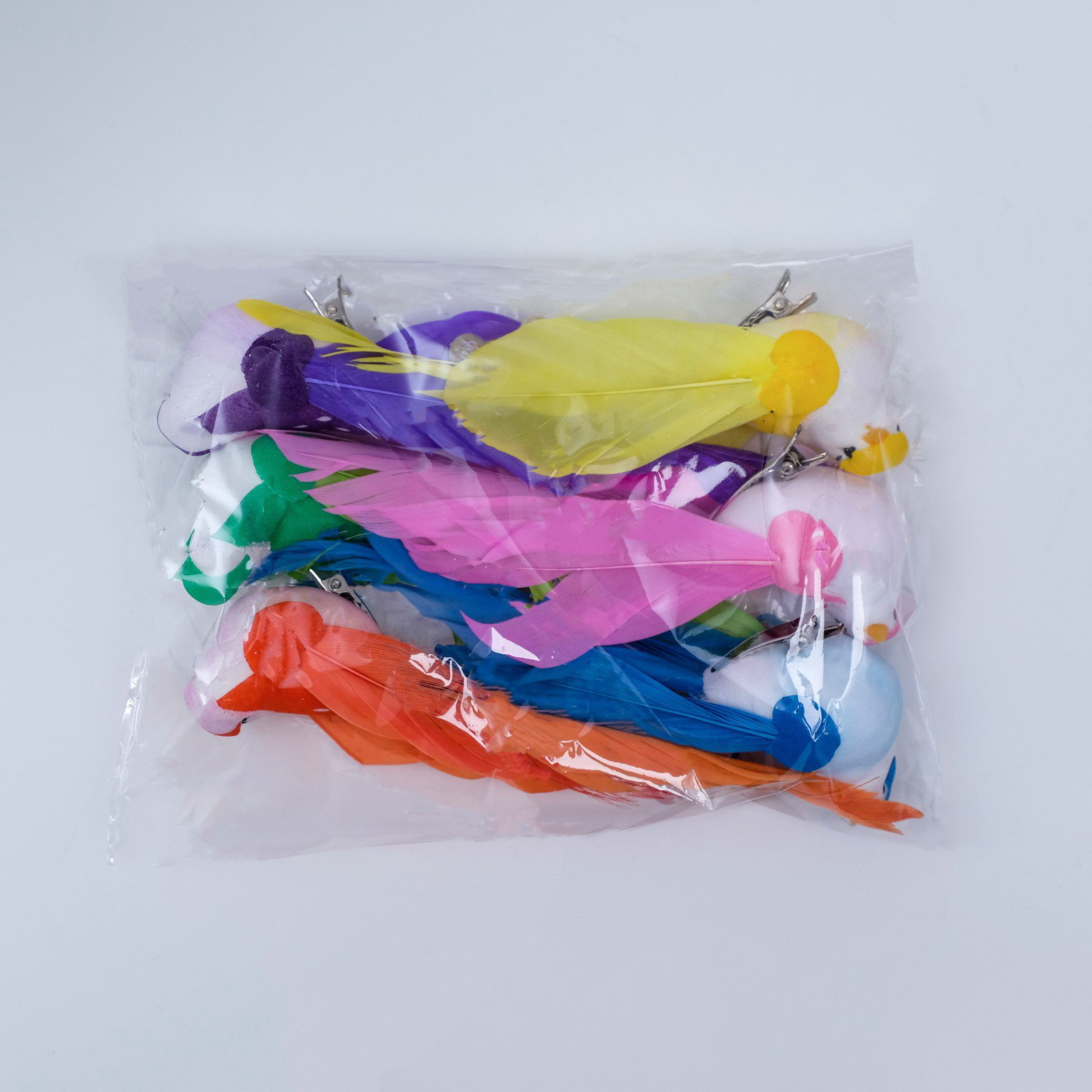 Размер упаковки: 13 x 3 x 3 см. tnved: 6701000000 Вид декора: Прищепки Цвет: МИКС Набор: Нет Яркий акцент для праздничного декора! Декор "Птица" на прищепке 10x3 см это отдельное украшение из пенопласта и перьев в одном из цветов микс. Прищепка дает возможность легко закрепить птицу в любой композиции.