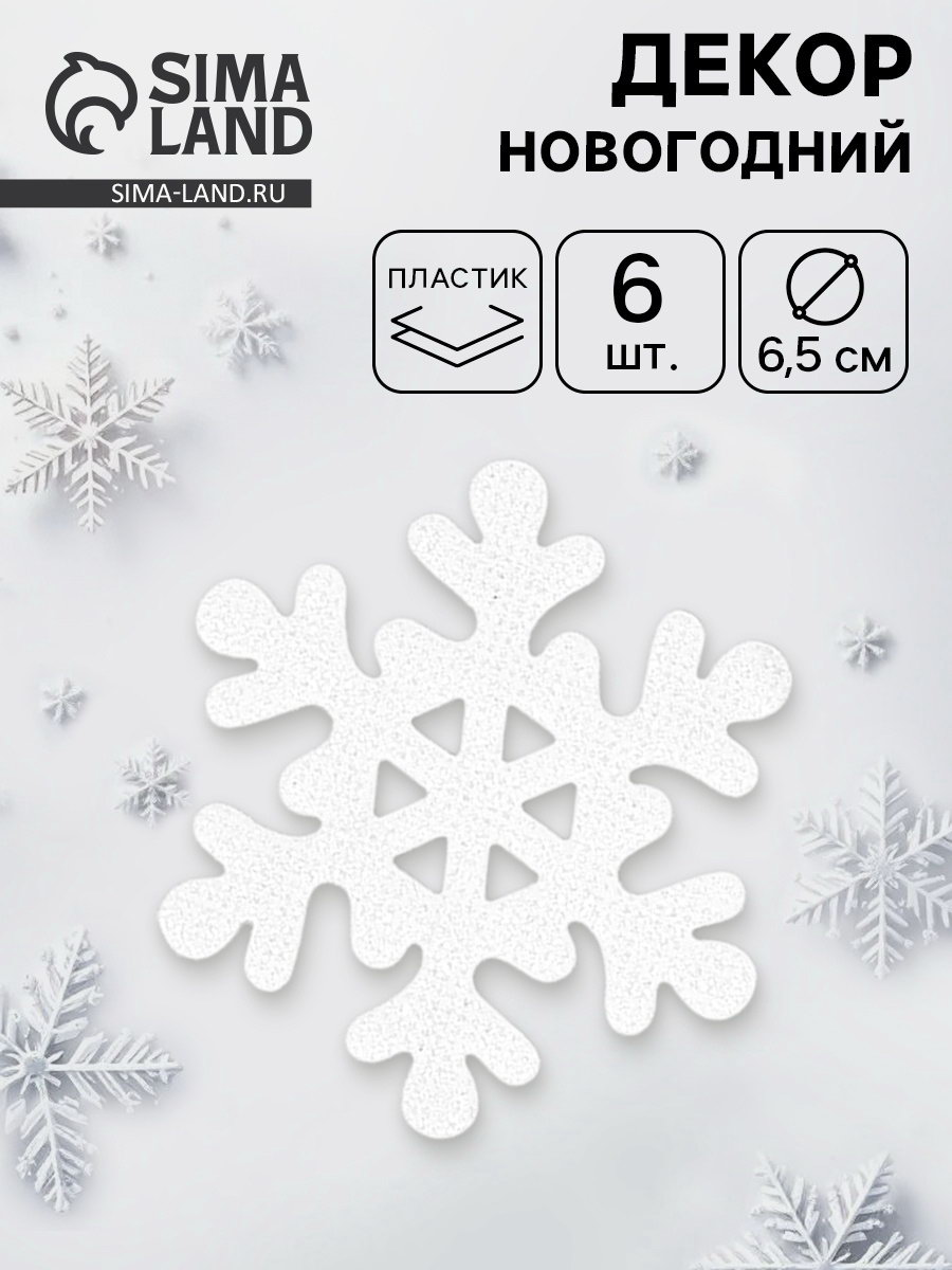 Размер упаковки: 10 x 0.4 x 18 см. tnved: 9505900000 Вид декора: Снежинки Набор: Да Цвет: Белый Символ года: Нет Тематика праздника: Новый год Новый год самый волшебный праздник в году, и в этот день всё должно быть таким же сказочным и чудесным, особенно декор. В наборе 6 снежинок диаметром 6,5 см Как прикрепить декор
