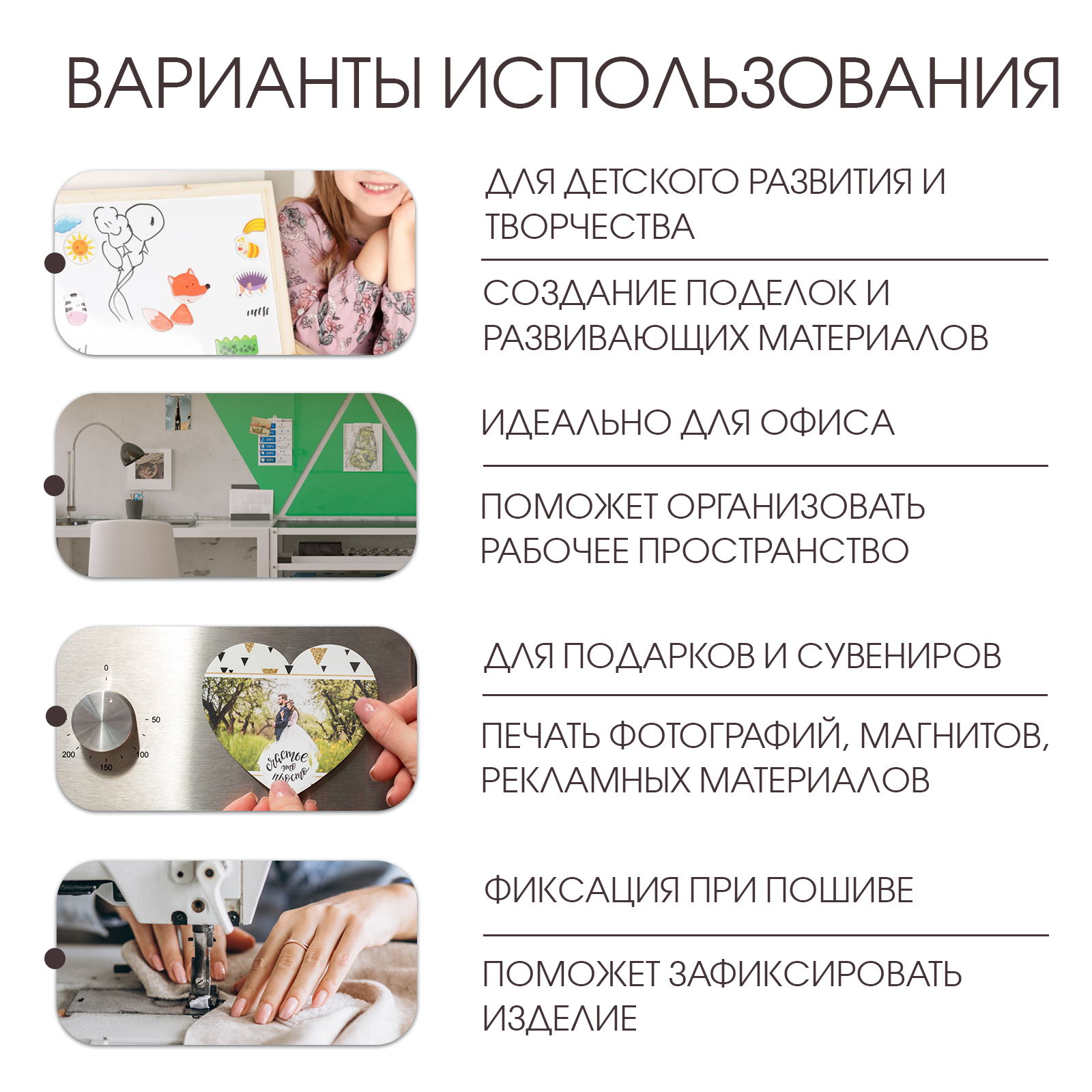 Широкие области применения Магнитный винил можно использовать не только для домашних хозяйственных нужд, но и в большом количестве сфер. Он станет отличным помощником в офисе, в классе для учебных пособий или даже в кафе для сменных меню. Комплект