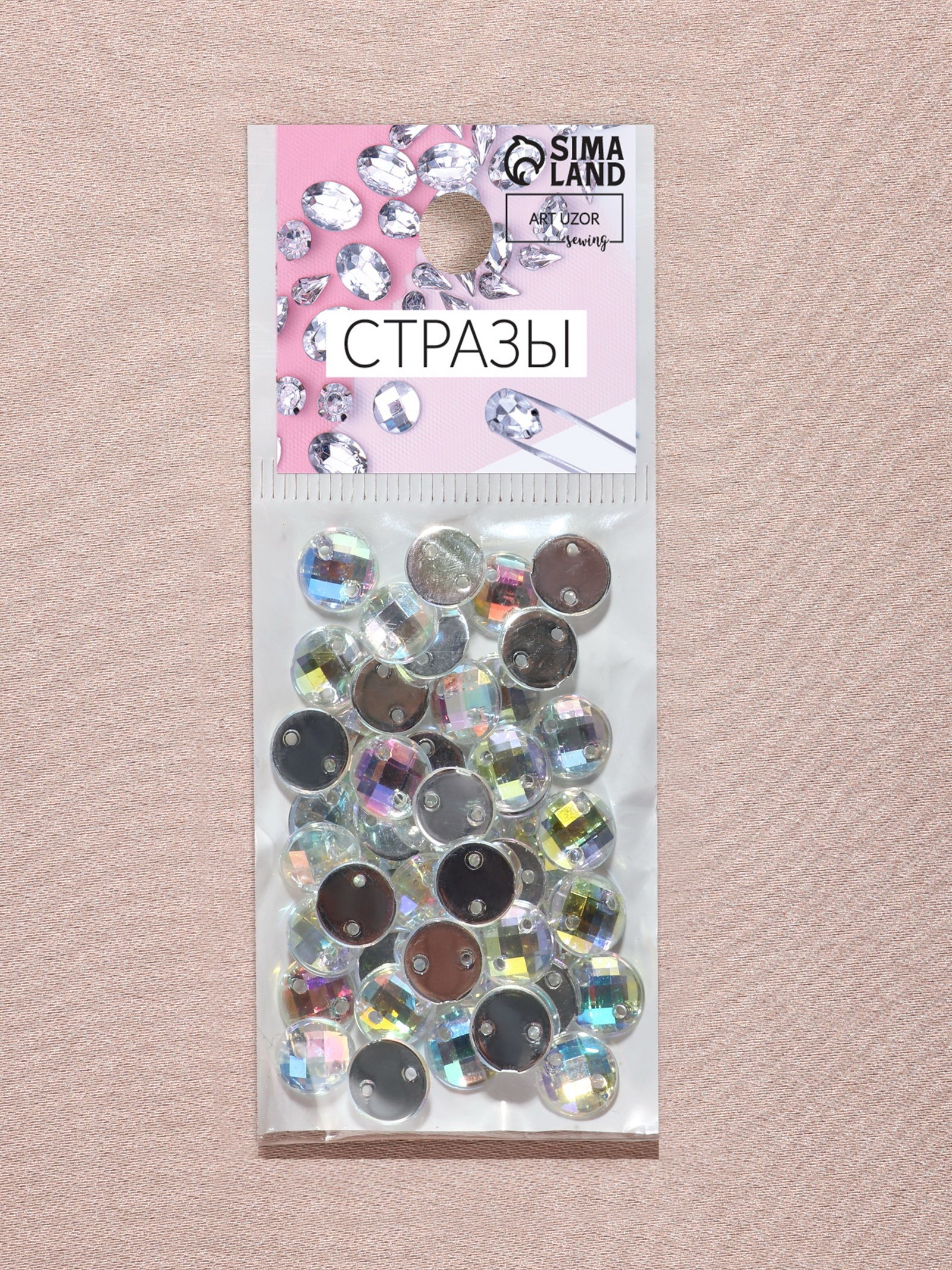 Стразы пришивные "Шатон", круглые, из органического стекла, с голографией, d=8 мм, 50 шт., 4x9.5x1.5 см., Арт Узор, Китай