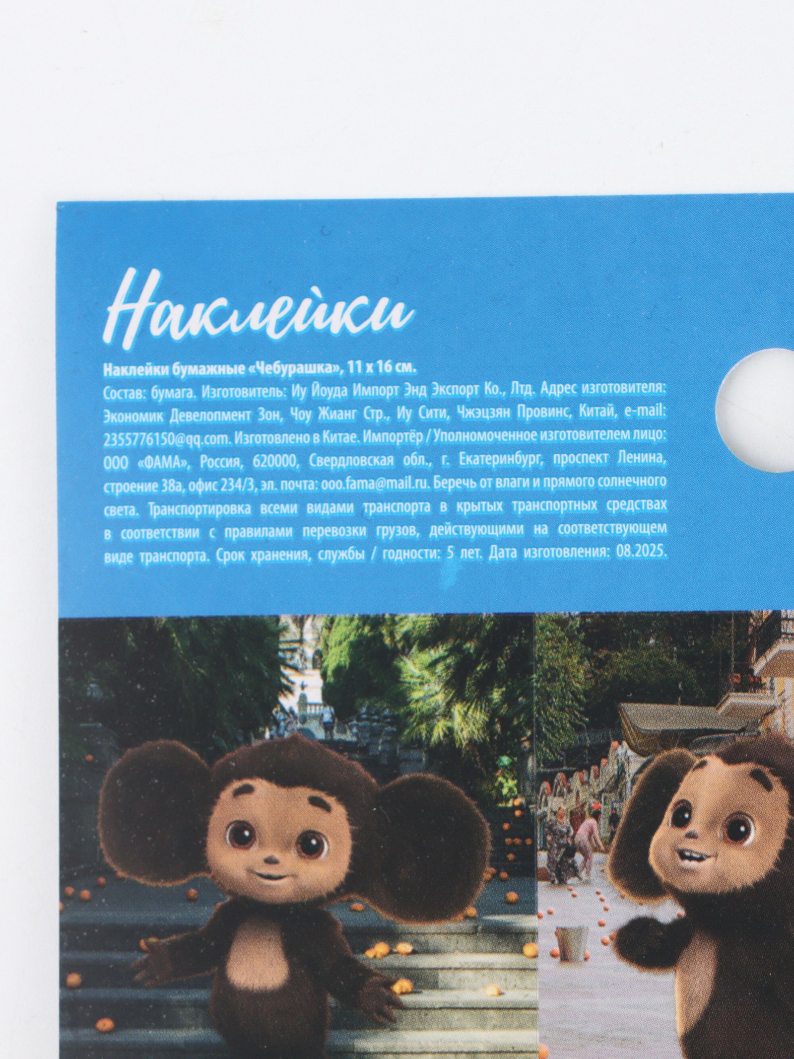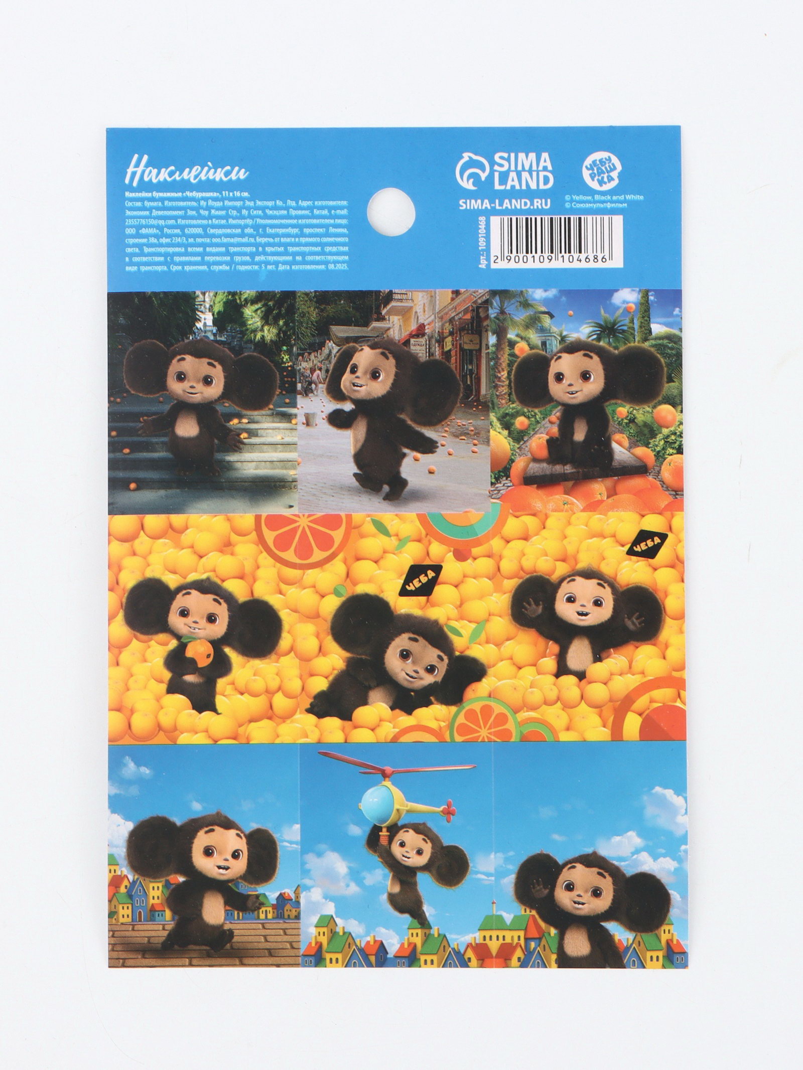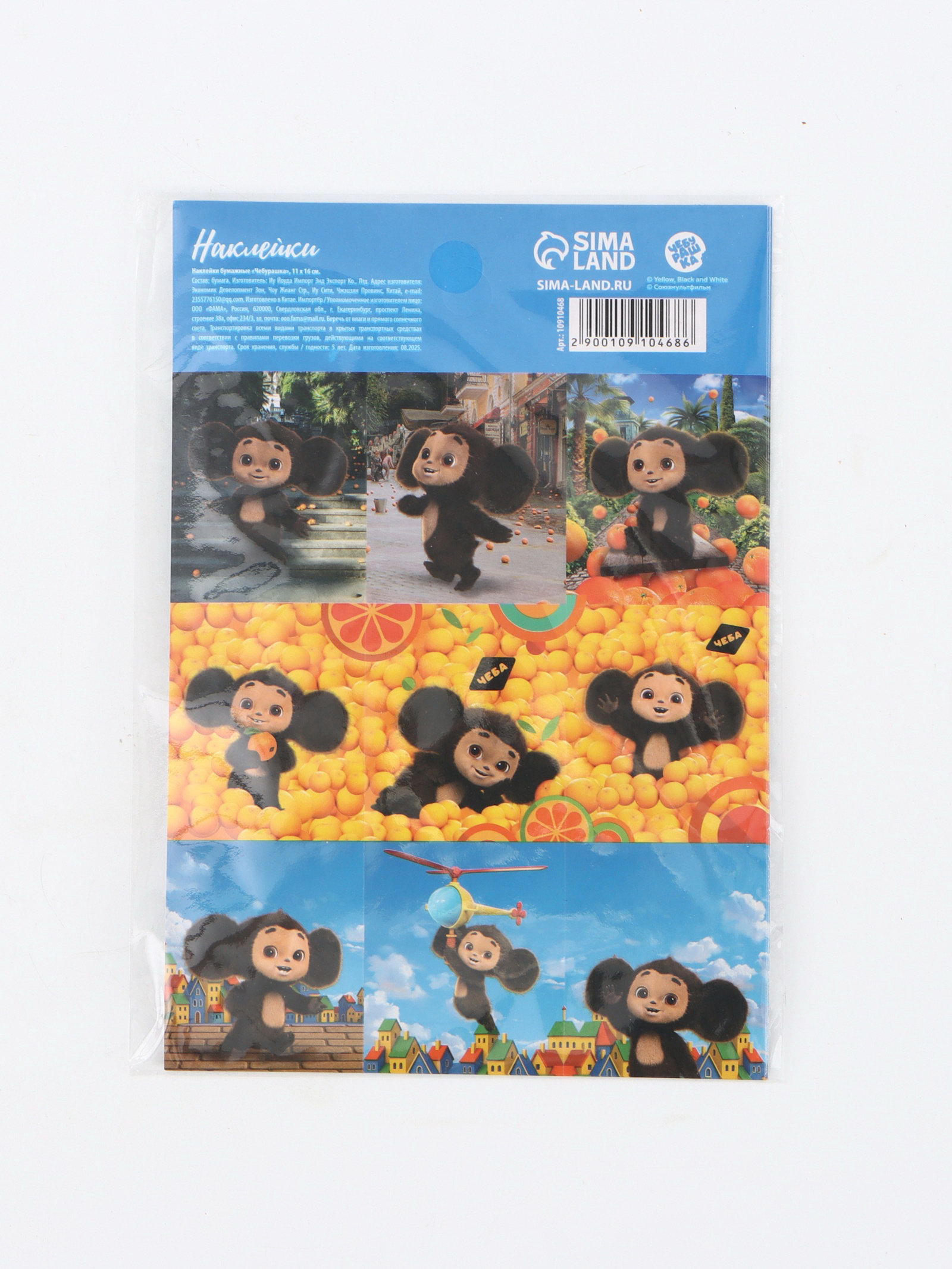 Наклейки бумажные "Чебурашка",11 x 15.5 см, 15.5x11x0.1 см., ЧЕБУРАШКА, Китай