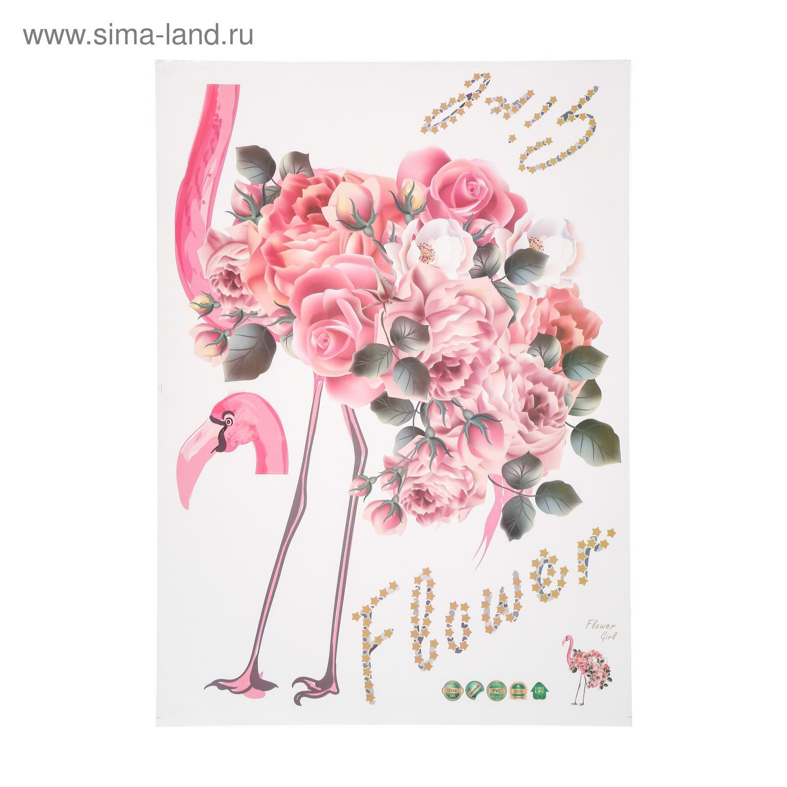Наклейка пластик интерьерная "Фламинго с розами на хвосте" 50х70 см, 70x50 см., Китай