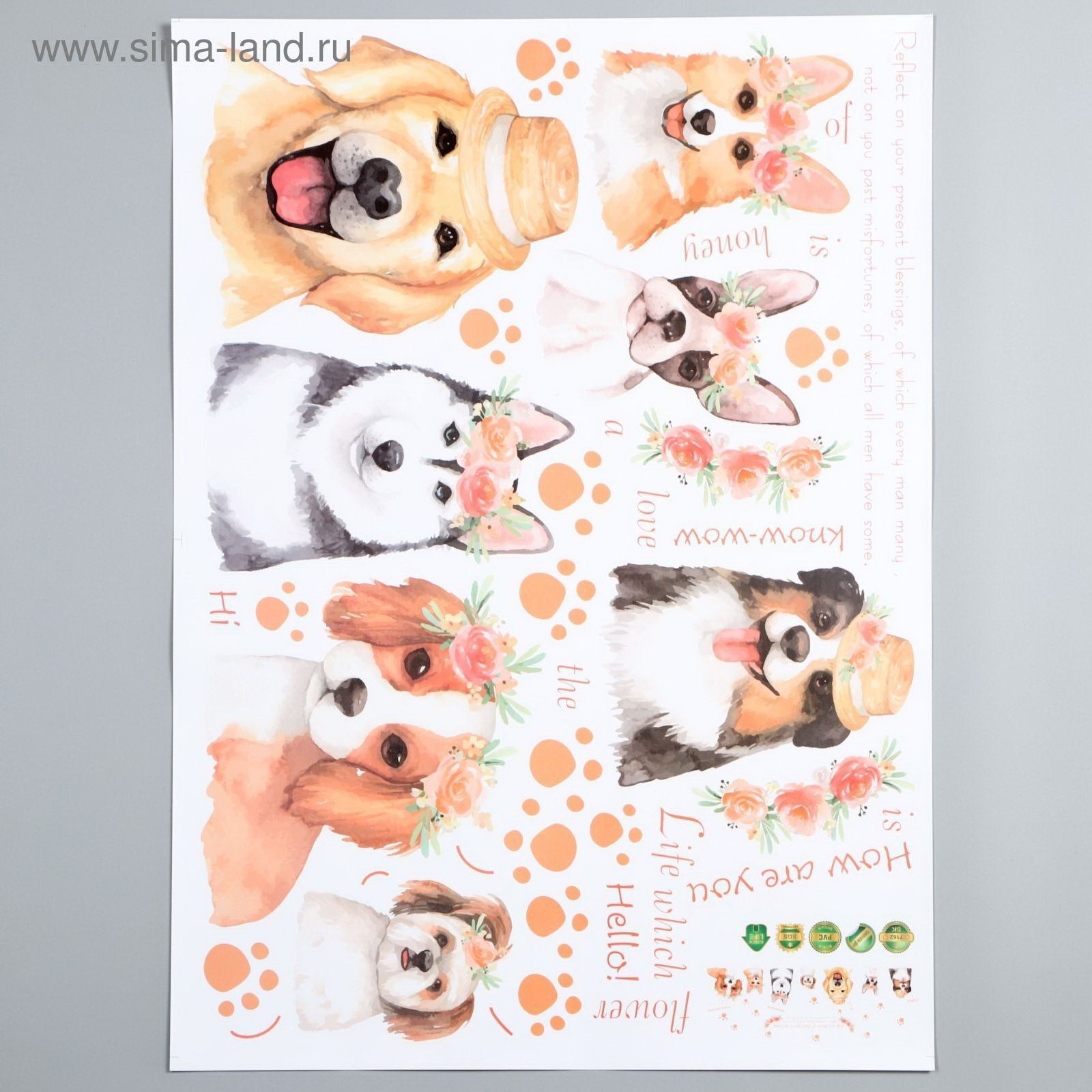 Наклейка интерьерная "Собаки в цветочных венках", 50x70 см, 70x50 см., Китай
