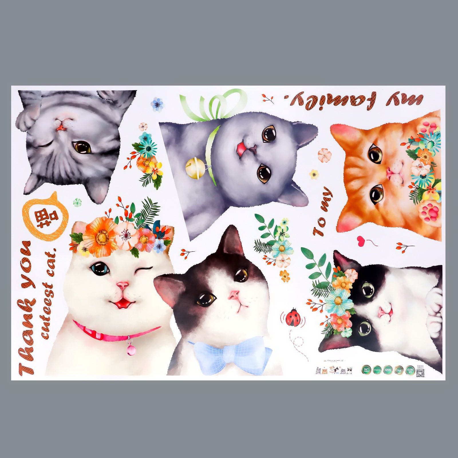 Наклейка интерьерная цветная "Кошечки с цветами", 60x90 см, 90x60 см., Китай