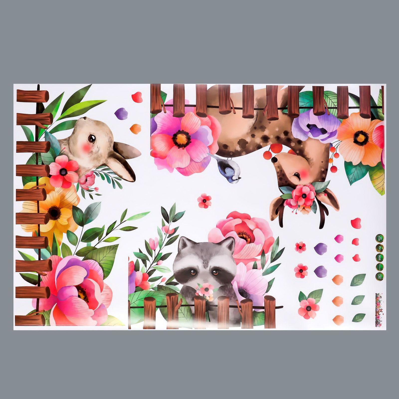 Наклейка пластик интерьерная цветная "Лесные зверушки в цветах" 60х90 см, 90x60 см., Китай