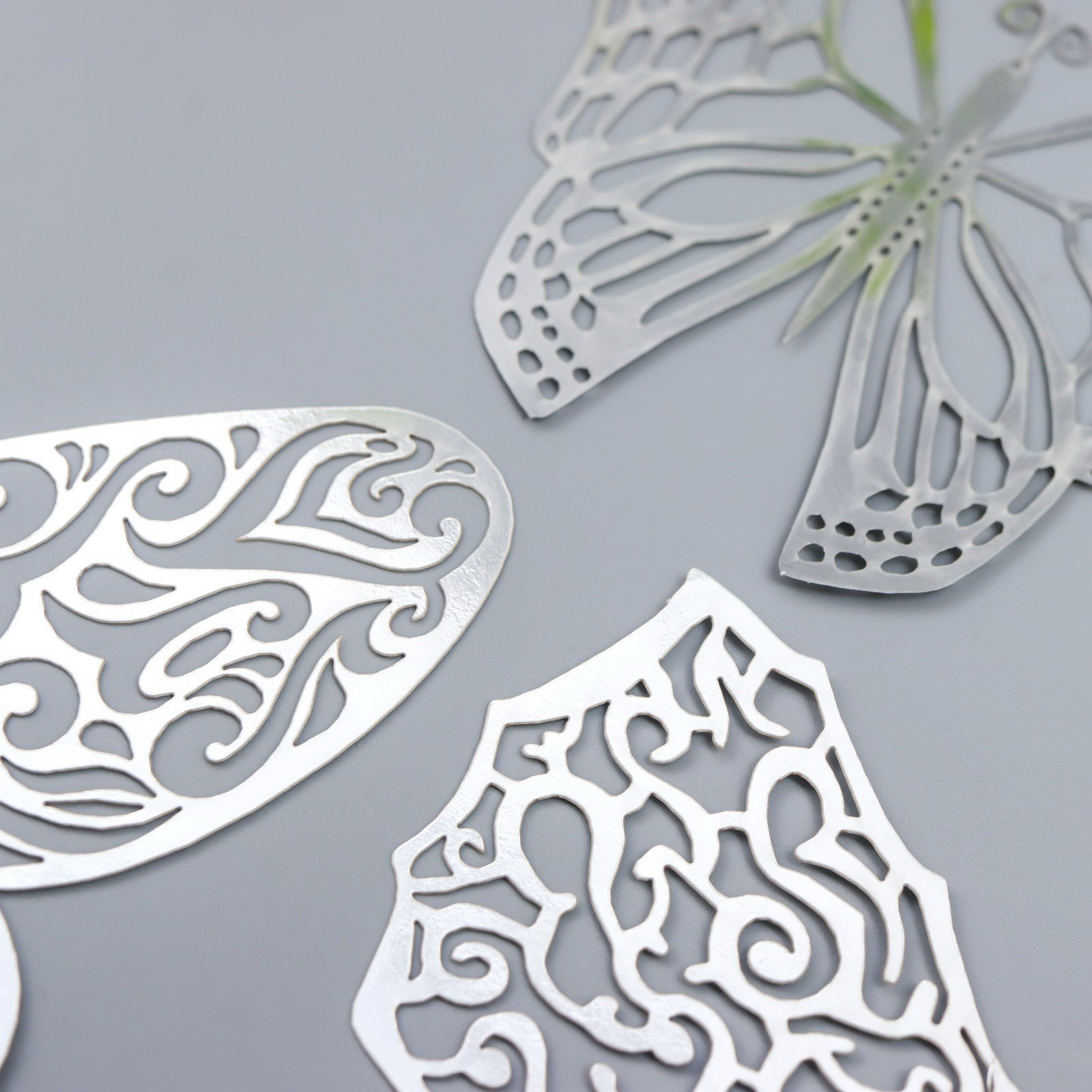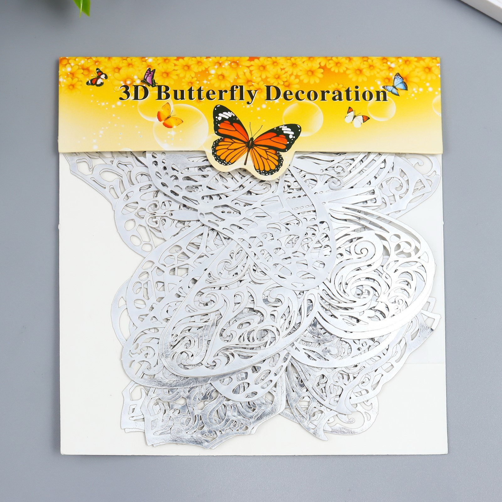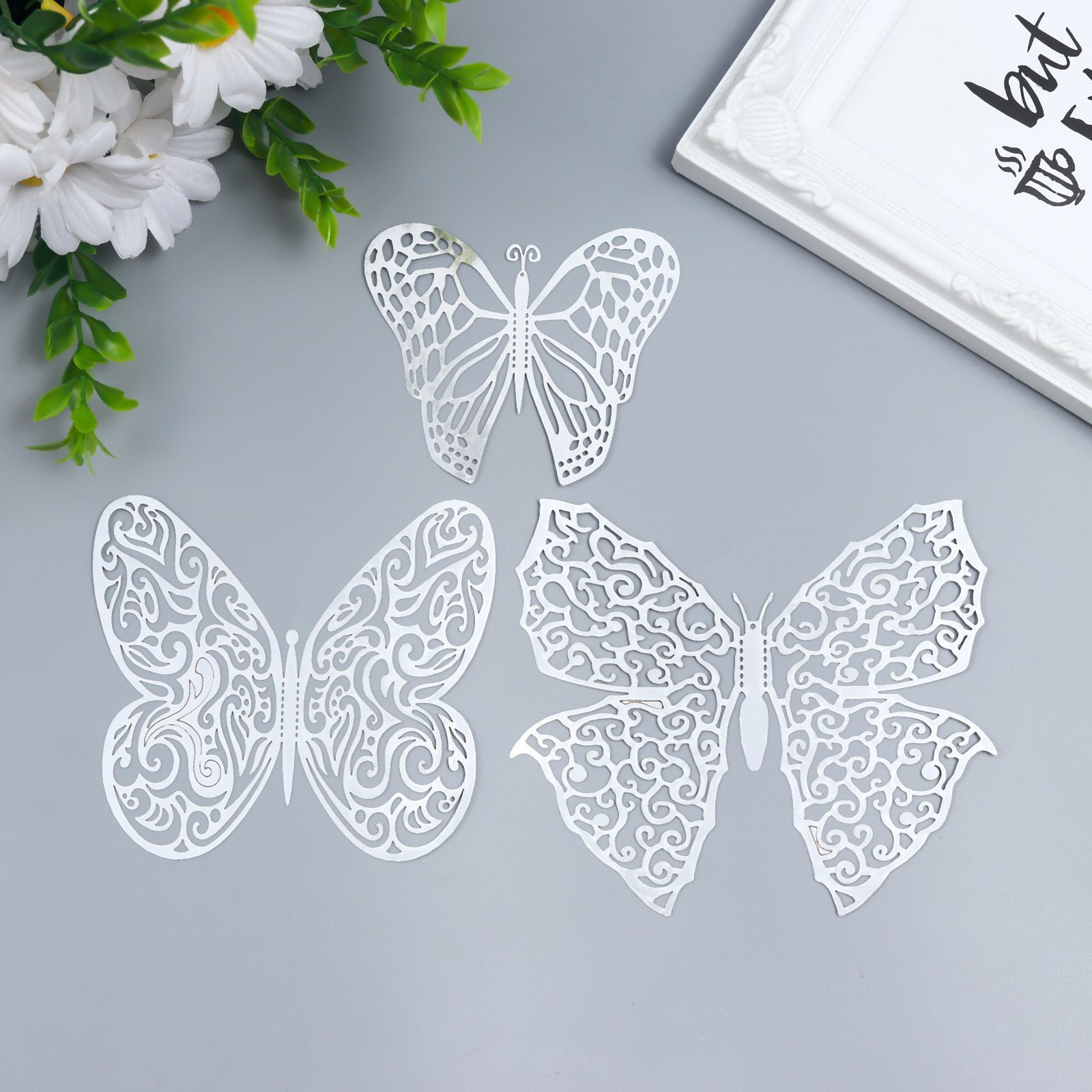 Наклейка пластик "Бабочки серебро ажурная", набор 12 шт.: 12 см, 10 см; 8 см, Китай