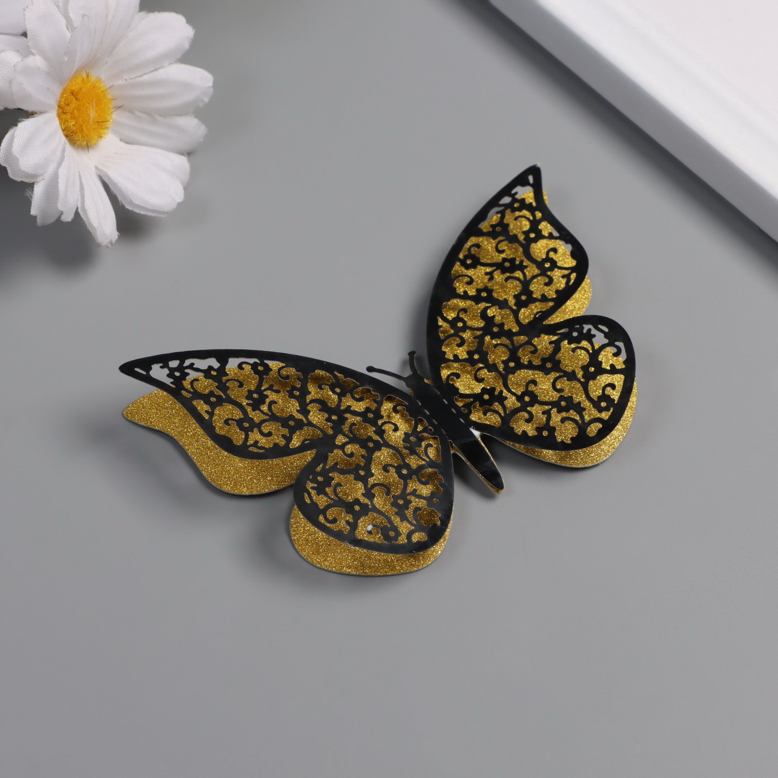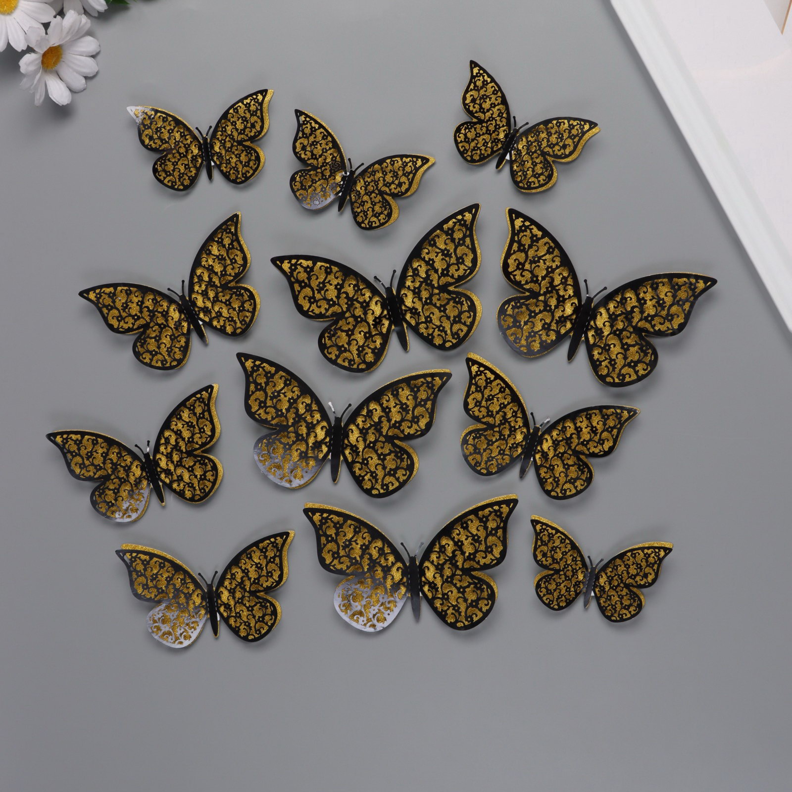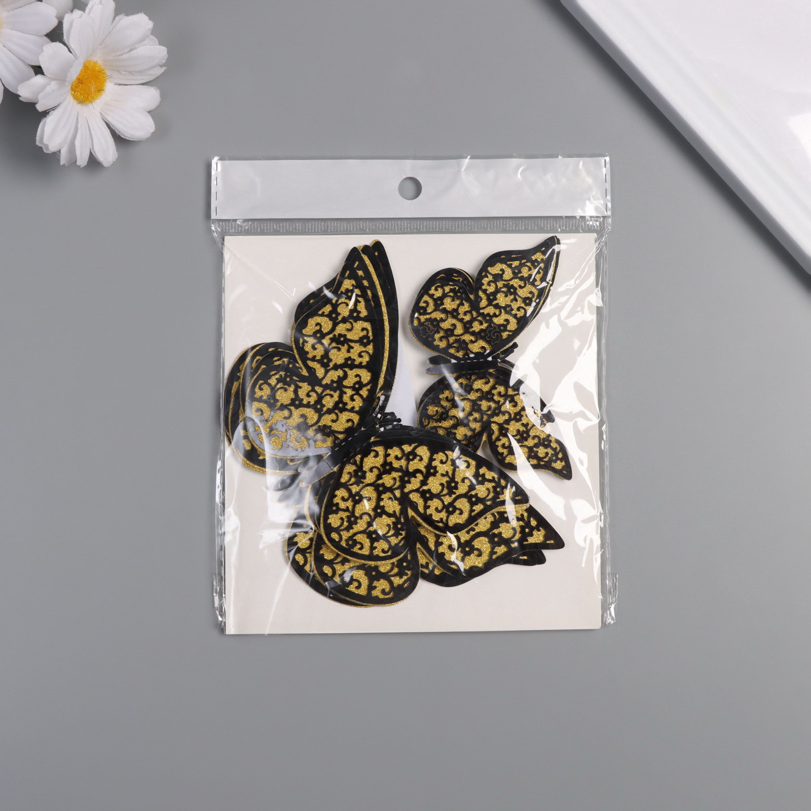 Наклейка бумага, пластик "Цветочные бабочки золото", блёстки, набор 12 шт.: 12 см; 10 см; 8 см, Китай