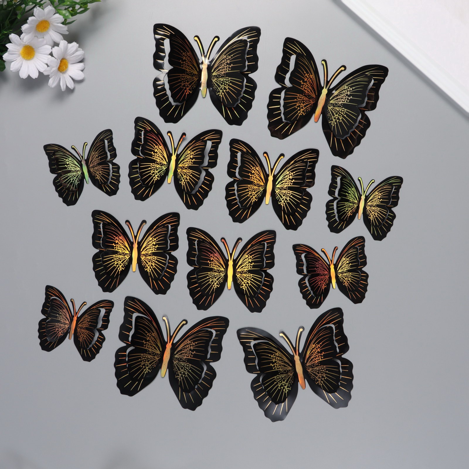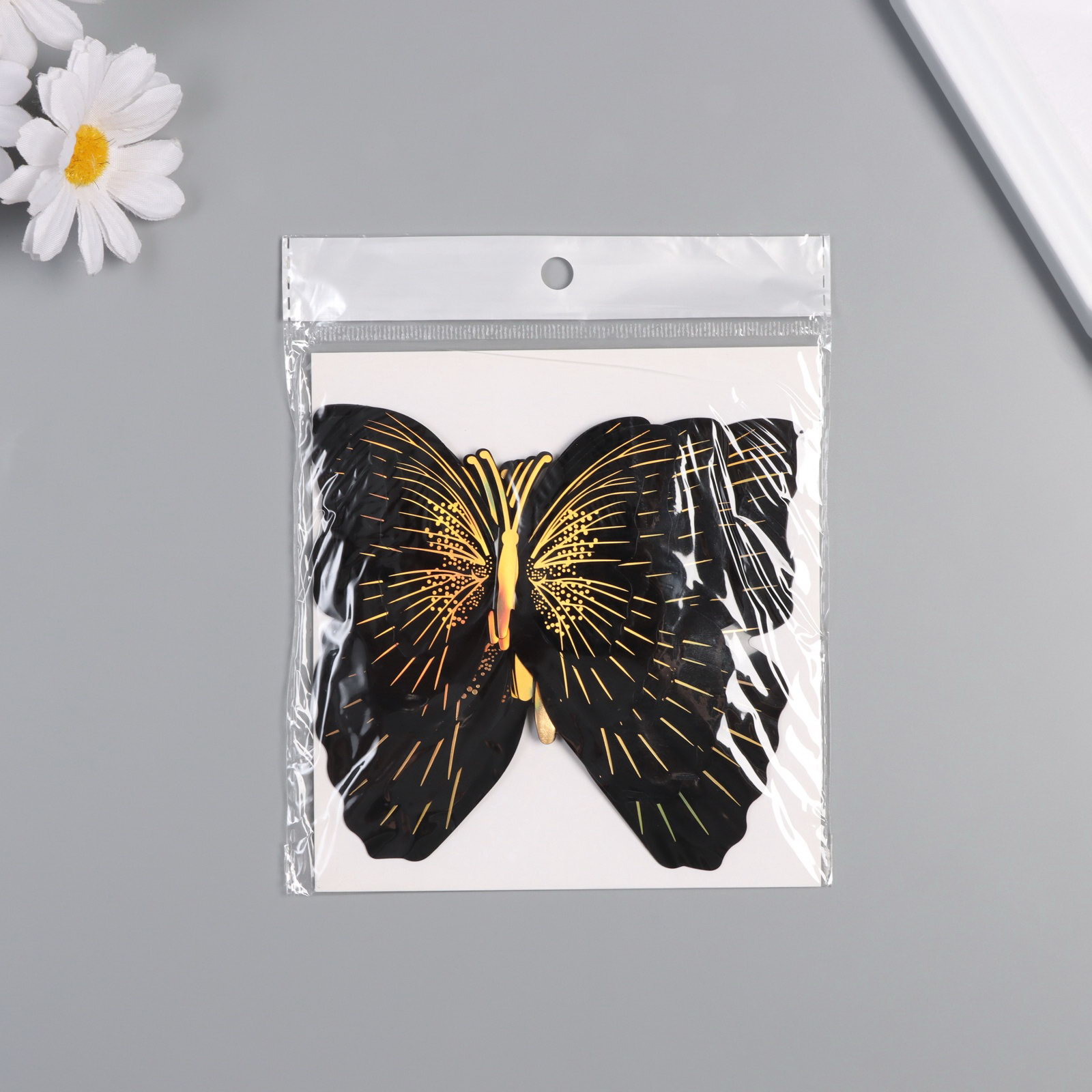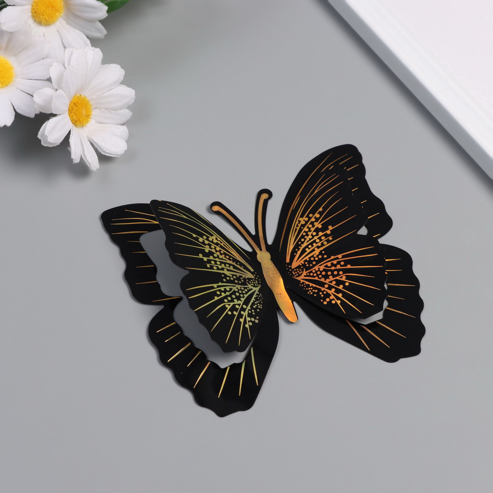 Наклейка пластик "Бабочки чёрные с золотом", двойные крылья, набор 12 шт.: 12 см, 10 см; 8 см, Китай
