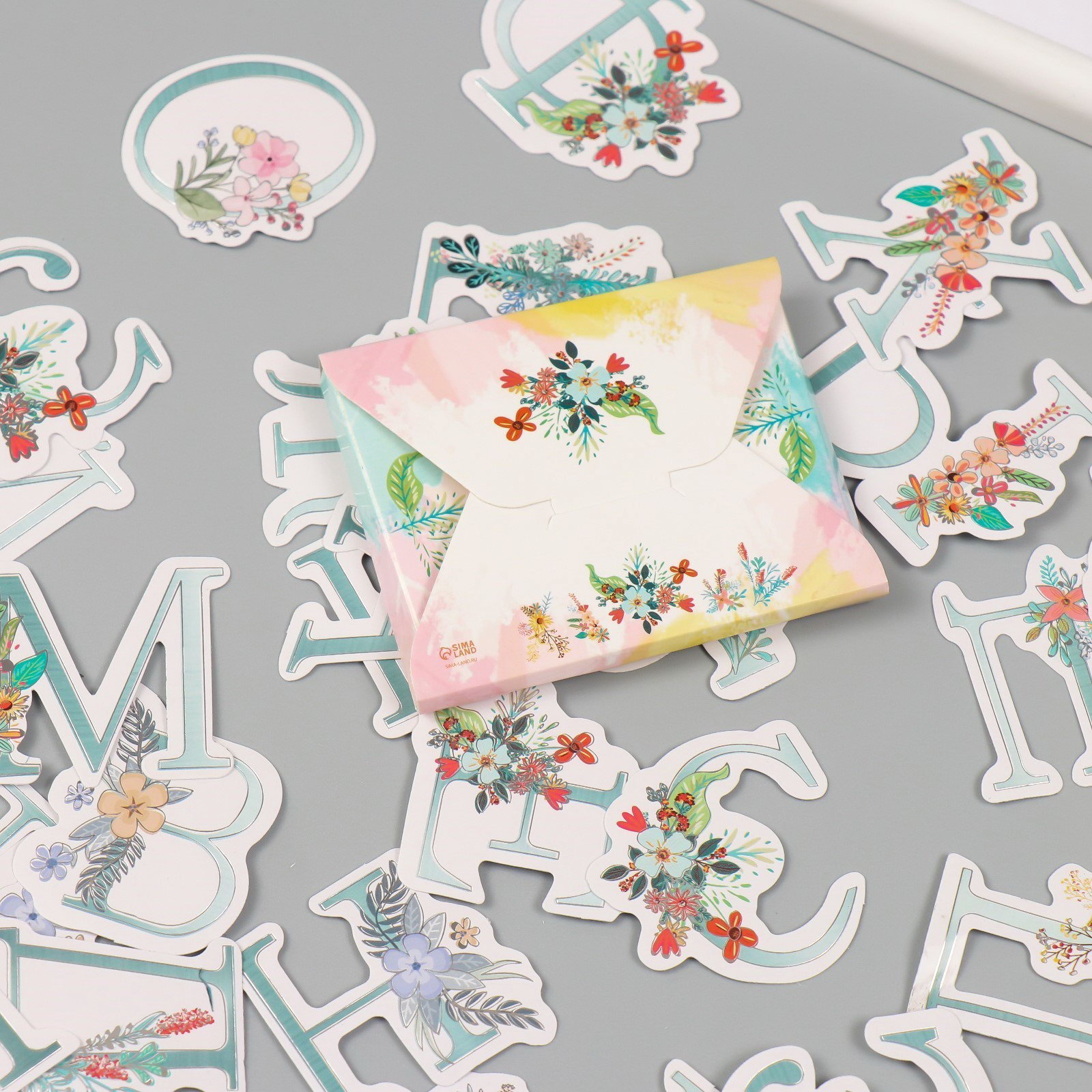 Наклейки для творчества "Цветочный алфавит", тиснение серебро, набор 33 шт., 9x7x0.8 см, 7x9x0.8 см., Арт Узор, Китай