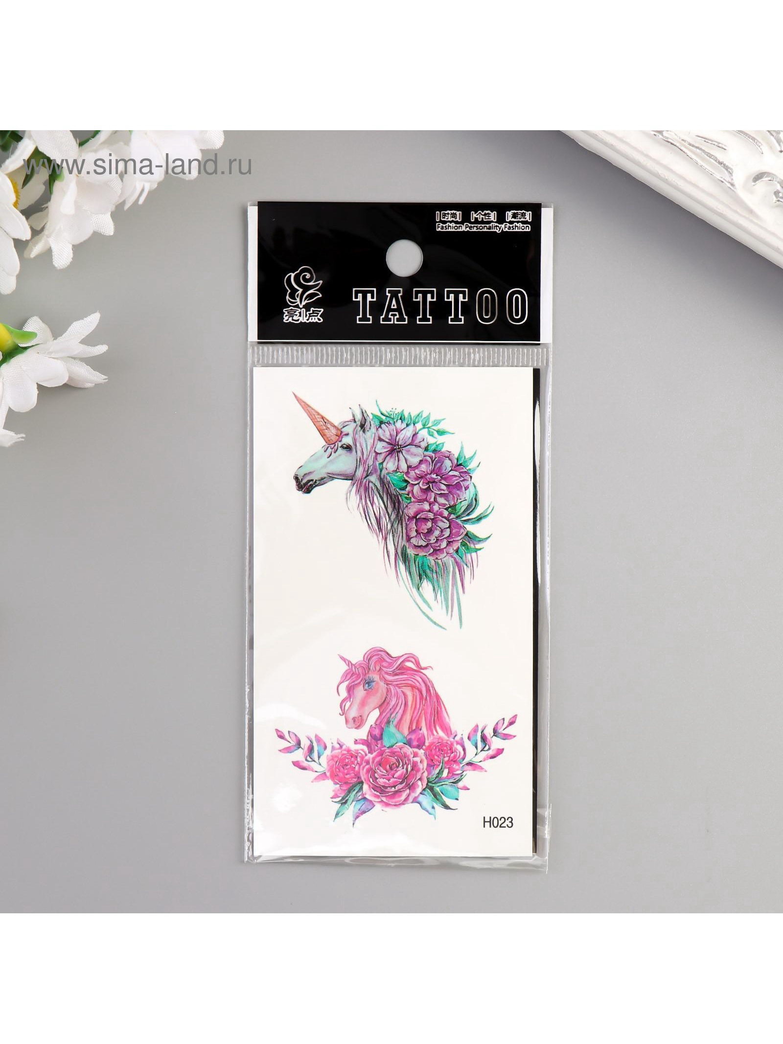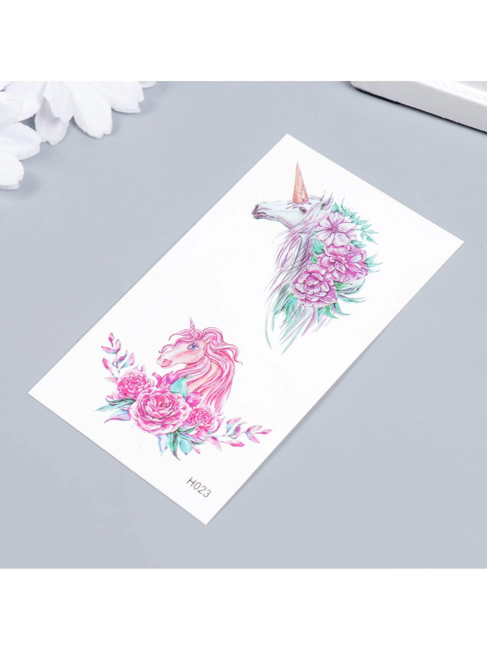 Переводные тату на тело цветные "Единороги и пионы", 10.5x6 см, 6x10.5 см., КИТАЙ