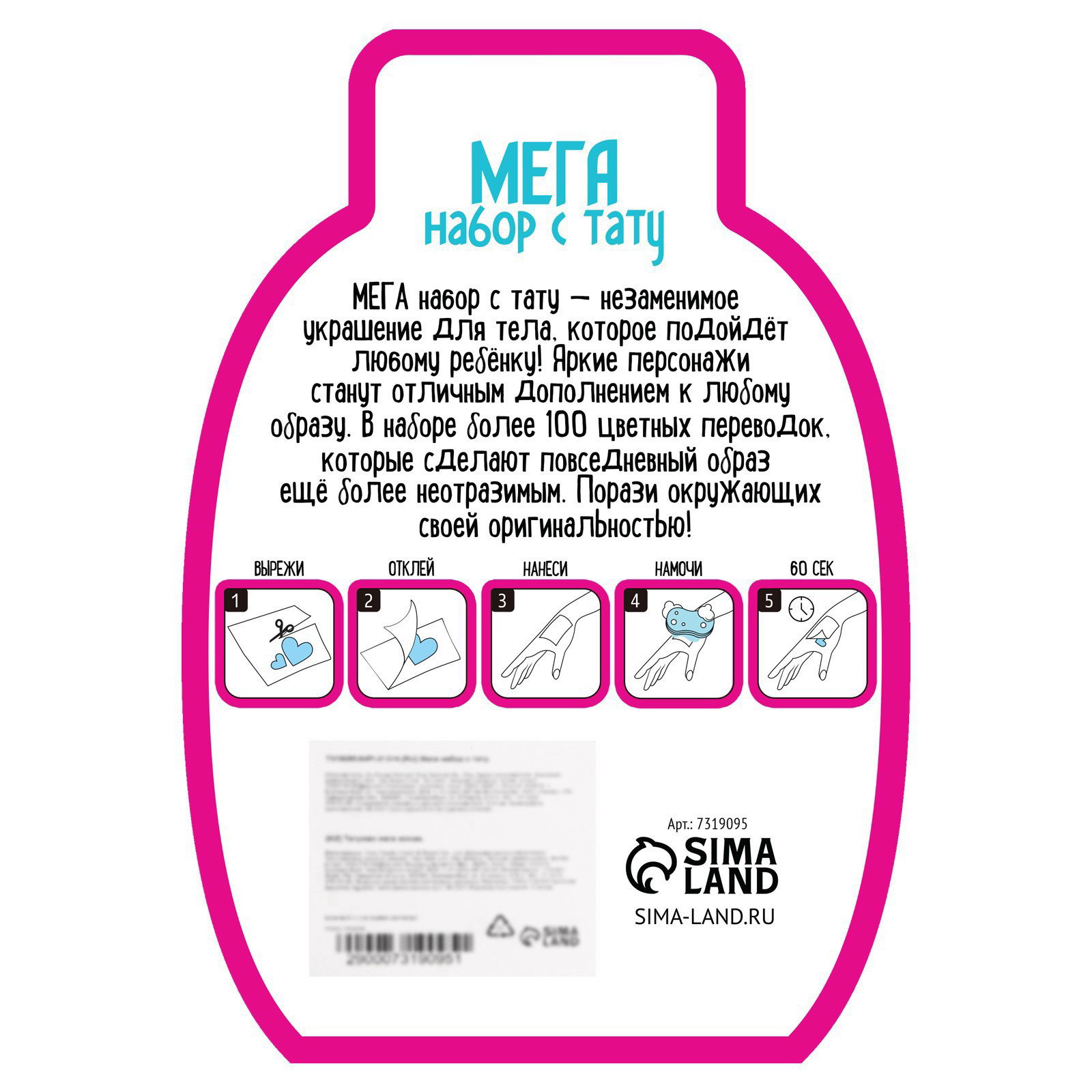 Размер упаковки: 14 x 0.5 x 20 см. Место приклеивания: Универсальное tnved: 4908900000 tnved: 4908900000 Вид: Детские Тематика праздника: 8 Марта Тематика: Животный мир Меганабор с тату эффектное украшение для тела, которое подойдёт каждой юной моднице! Яркие персонажи станут отличным дополнением к любому образу. В набор более 100 цветных переводок. Как нанести тату на тело