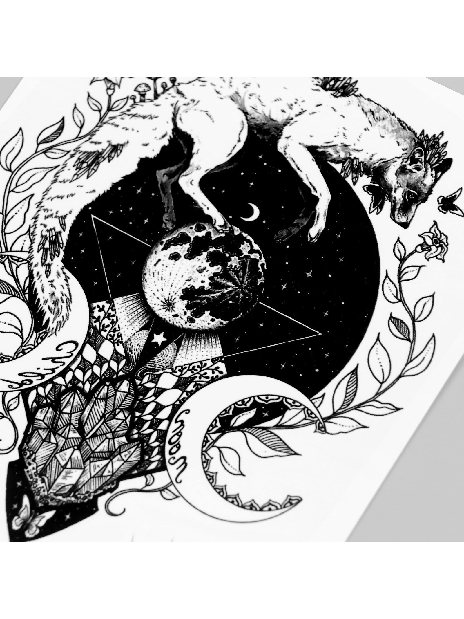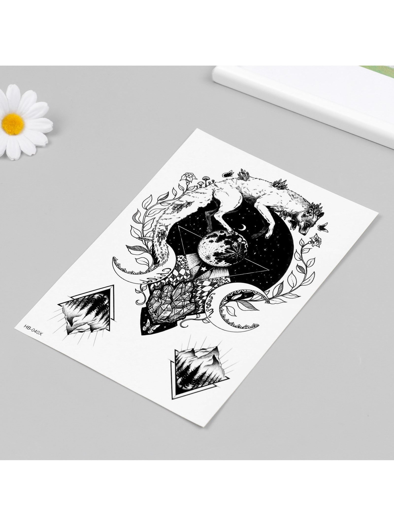 Переводная тату на тело чёрная "Лунный лис", 21x14.8 см, 14.8x21 см., Китай