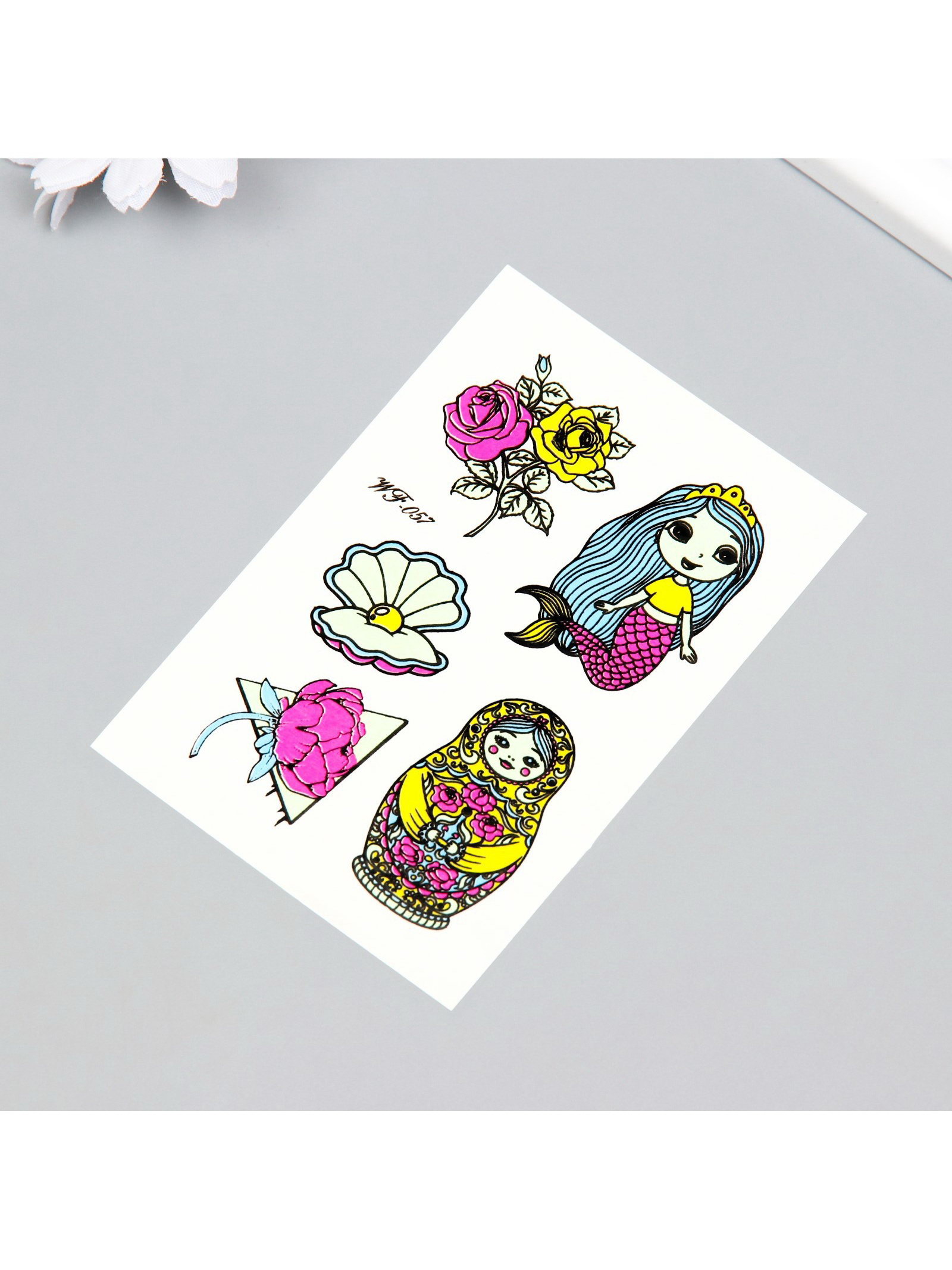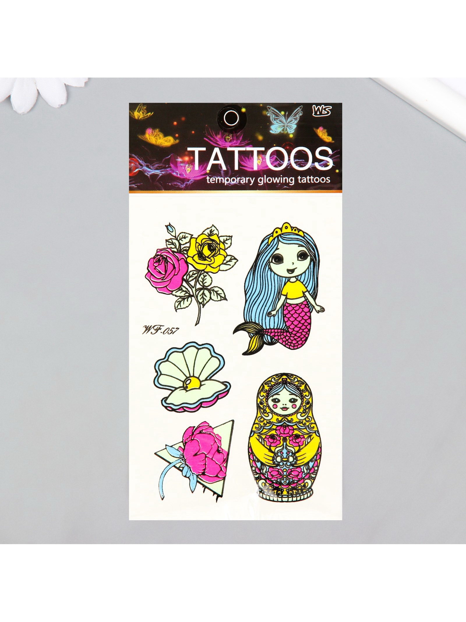 Переводные тату на тело светящиеся цветные "Матрёшка и русалка", 14.3x7.5 см, 7.5x14.3 см., Китай