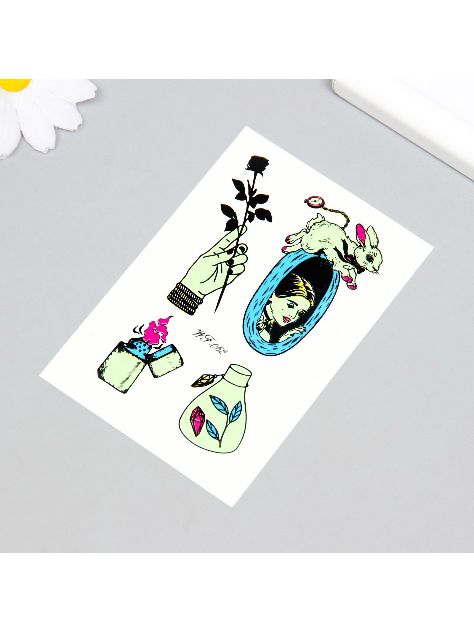 Переводные тату на тело светящиеся цветные "Алиса в норе", 14.3x7.5 см, 7.5x14.3 см., Китай