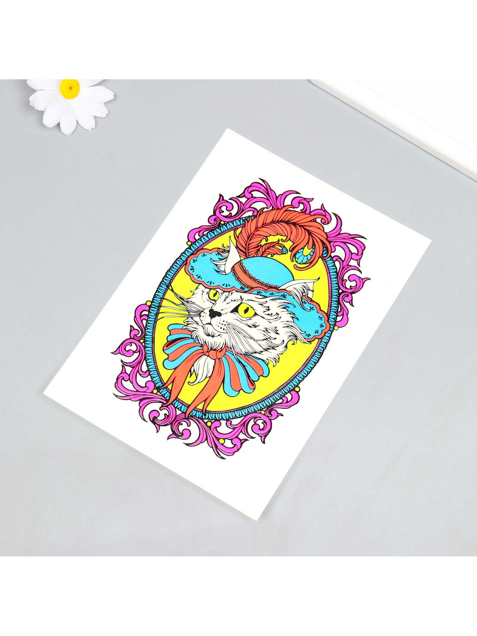 Переводная тату на тело цветные "Кот в шляпе", неон, 26x14.5 см, 14.5x26 см., Китай