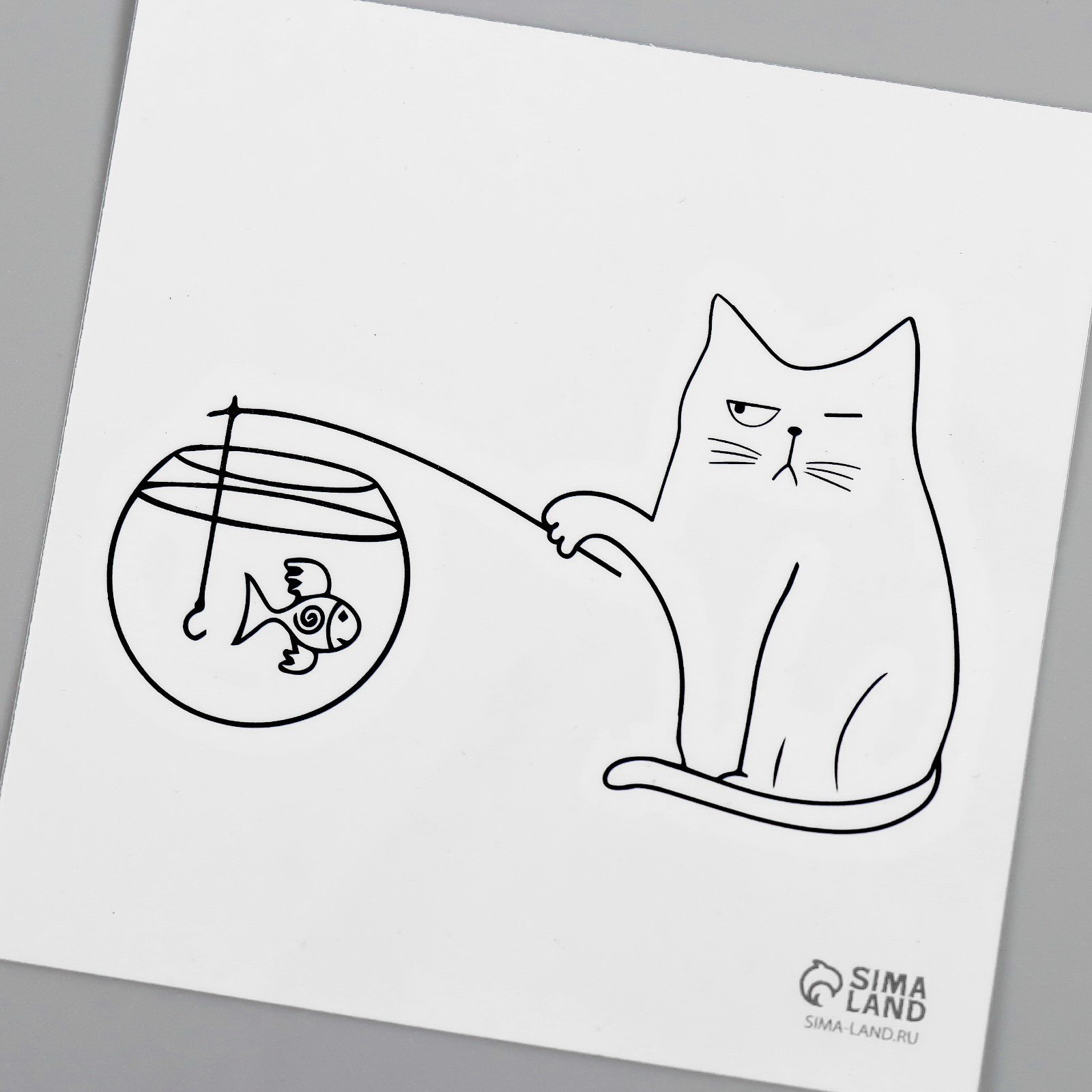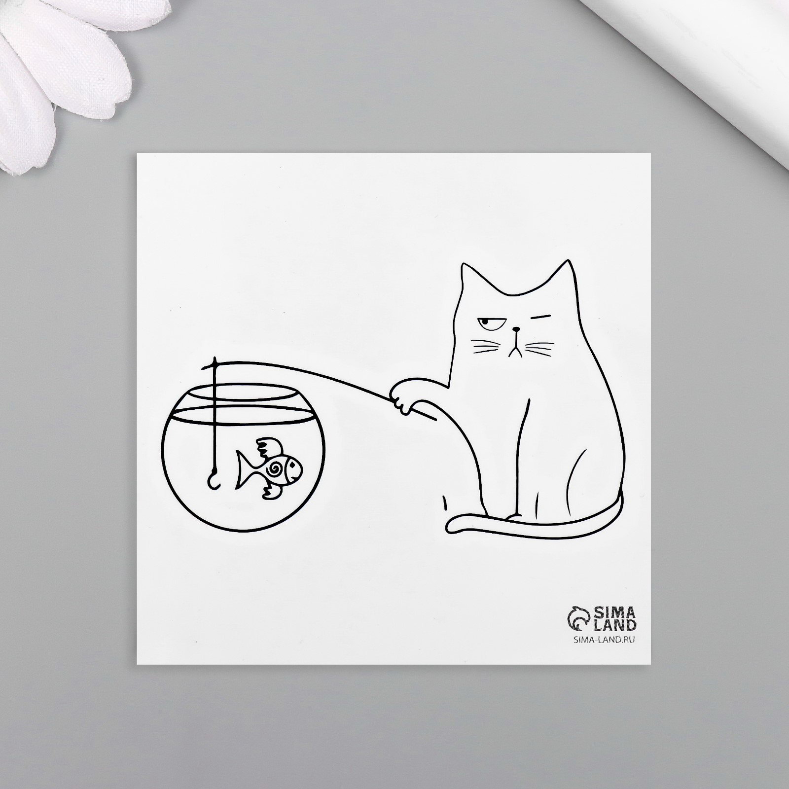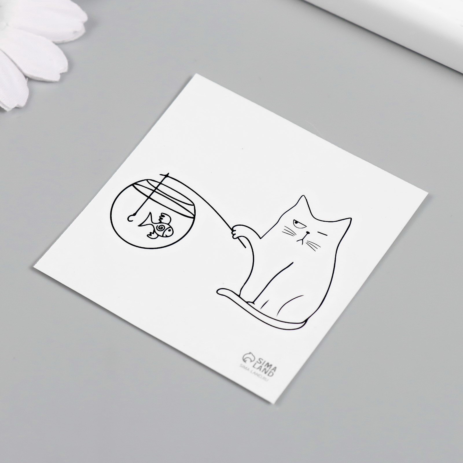 Переводная тату на тело чёрная "Кот на рыбалке", 6x6 см, 6x6 см., Арт Узор, Китай